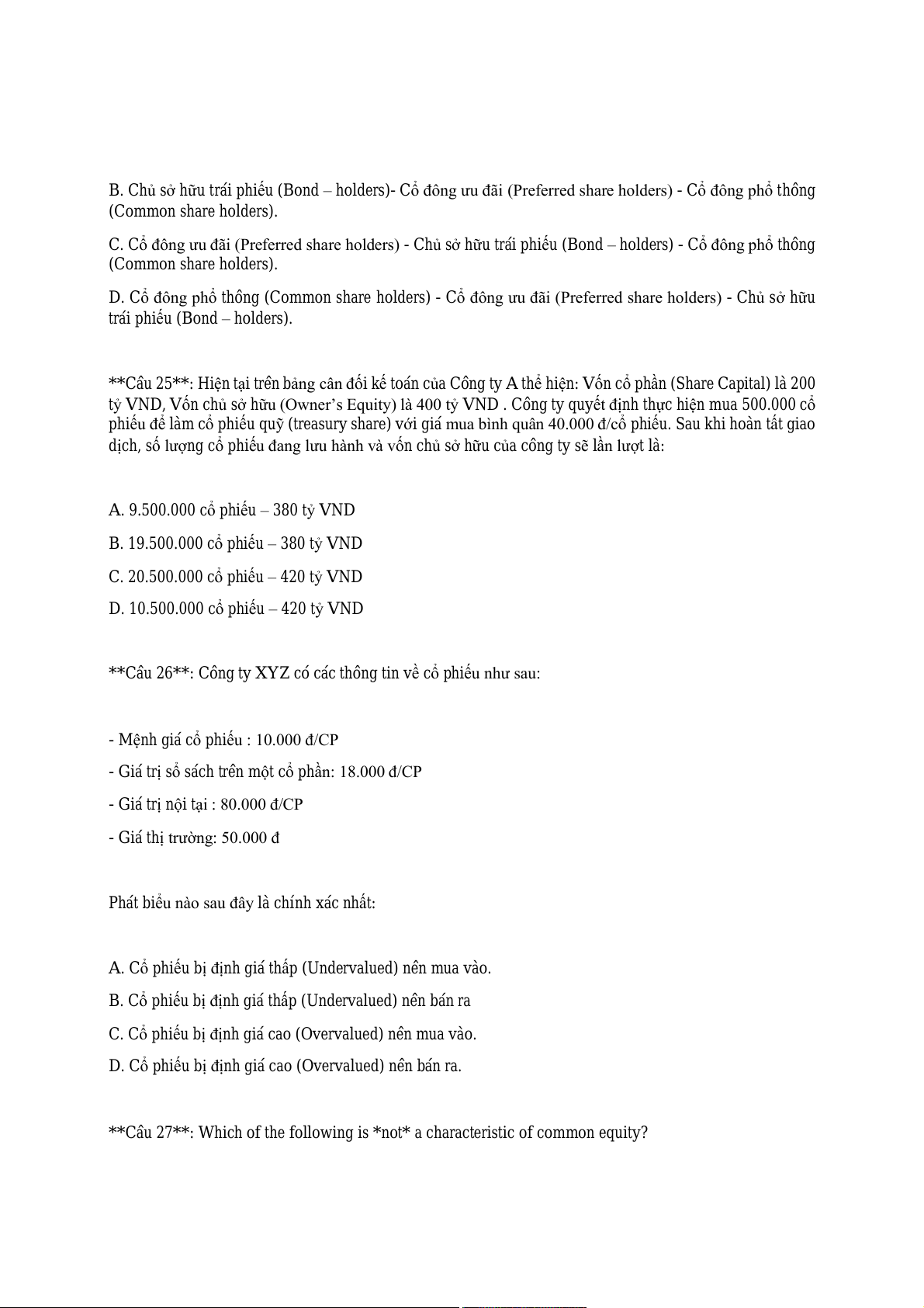 **Câu 25**: Hiện tại trên bảng cân đối kế toán của Công ty A thể hiện: Vốn cổ phần (Share Capital) là 200