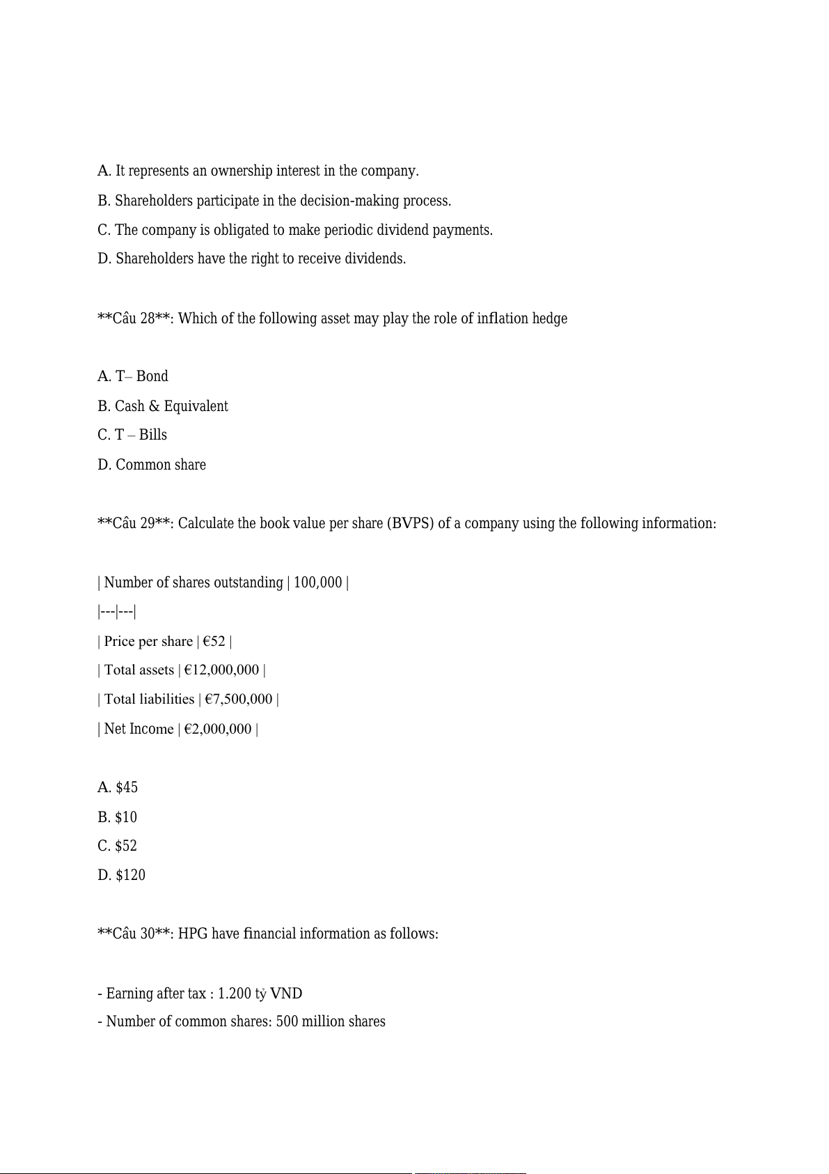**Câu 28**: Which of the fol owing asset may play the role of inflation hedge A. T– Bond B. Cash & Equivalent C. T – Bil s D. Common share