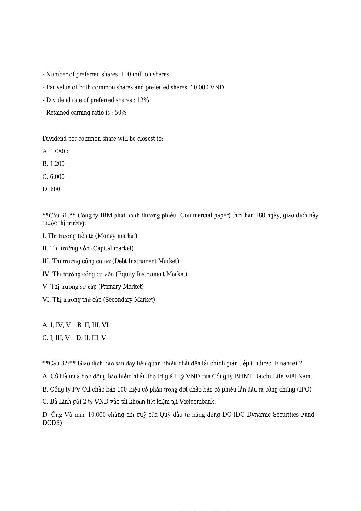 **Câu 31.** Công ty IBM phát hành thương phiếu (Commercial paper) thời hạn 180 ngày, giao dịch này thuộc thị trường: