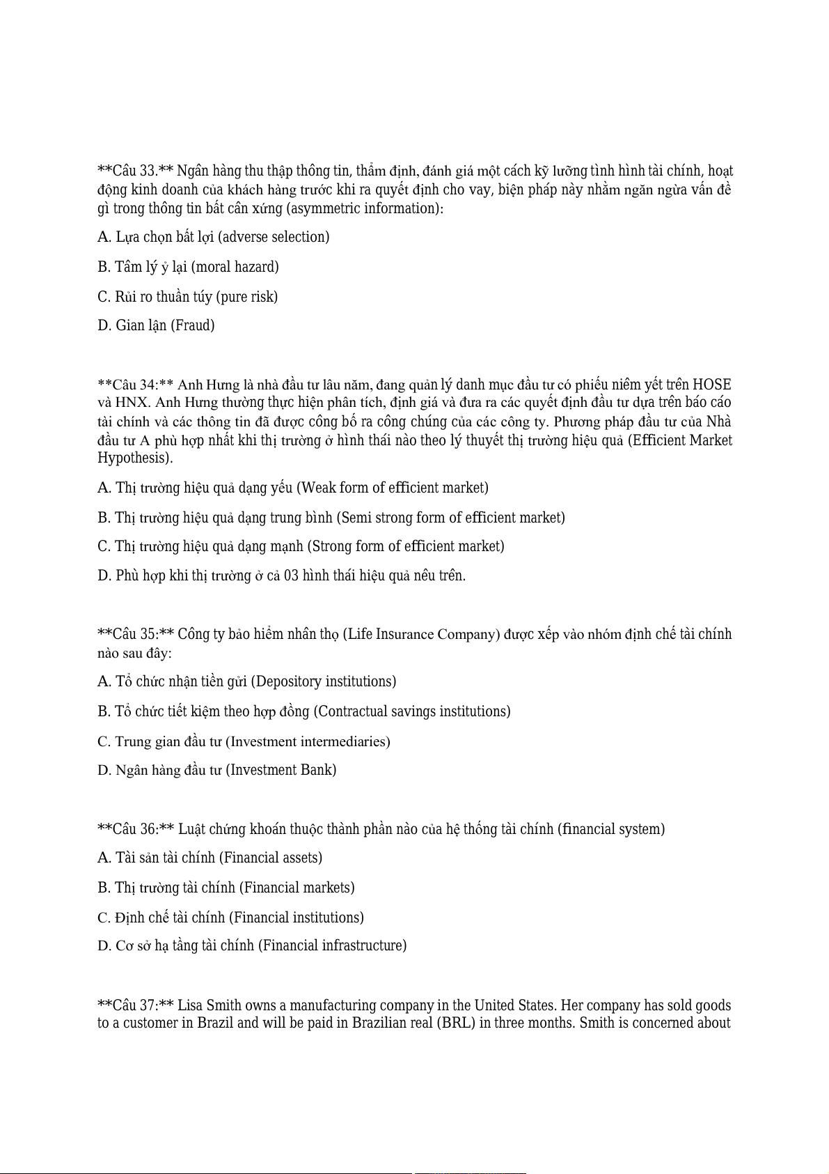 **Câu 35:** Công ty bảo hiểm nhân thọ (Life Insurance Company) được xếp vào nhóm định chế tài chính nào sau đây:
