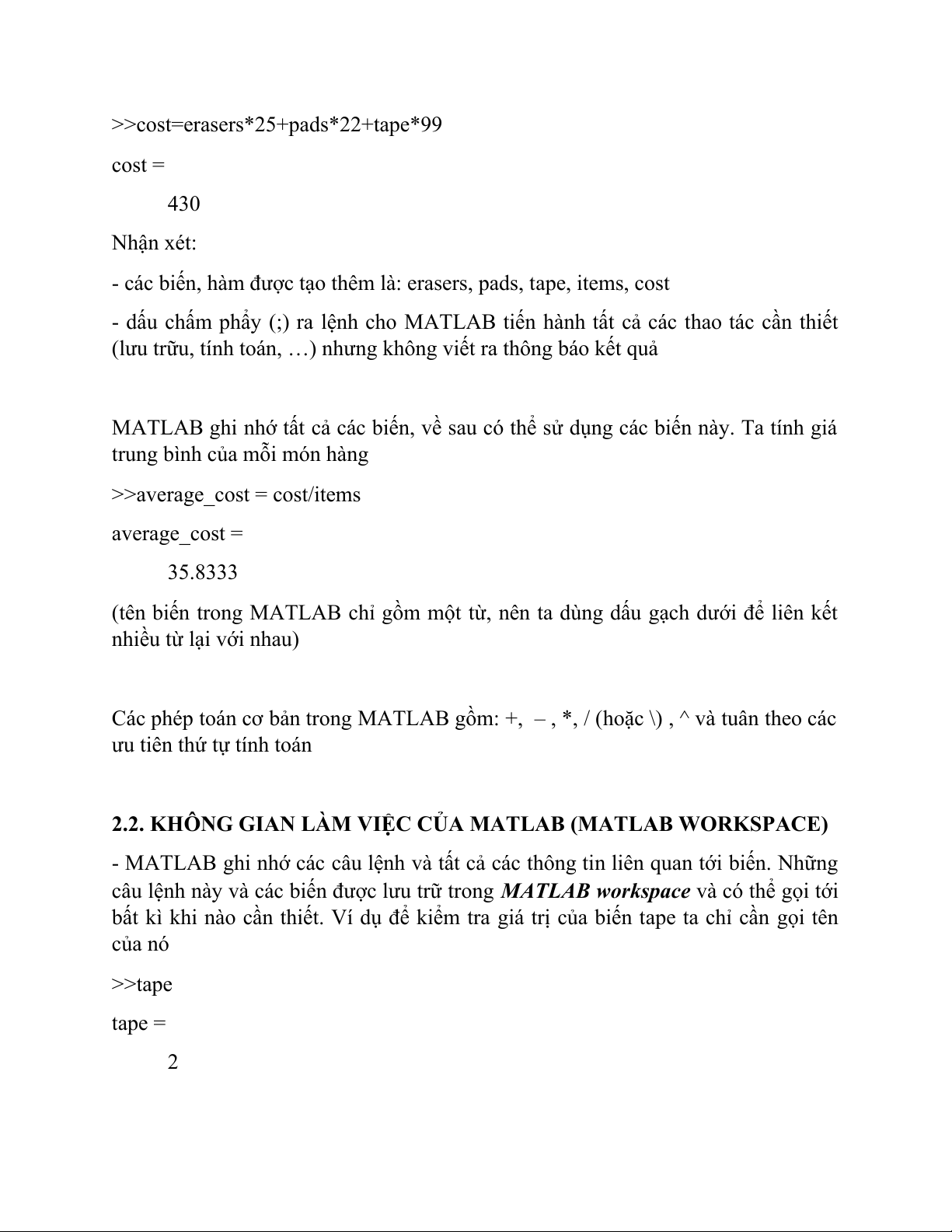 MATLAB ghi nhớ tất cả các biến, về sau có thể sử dụng các biến này. Ta tính giá