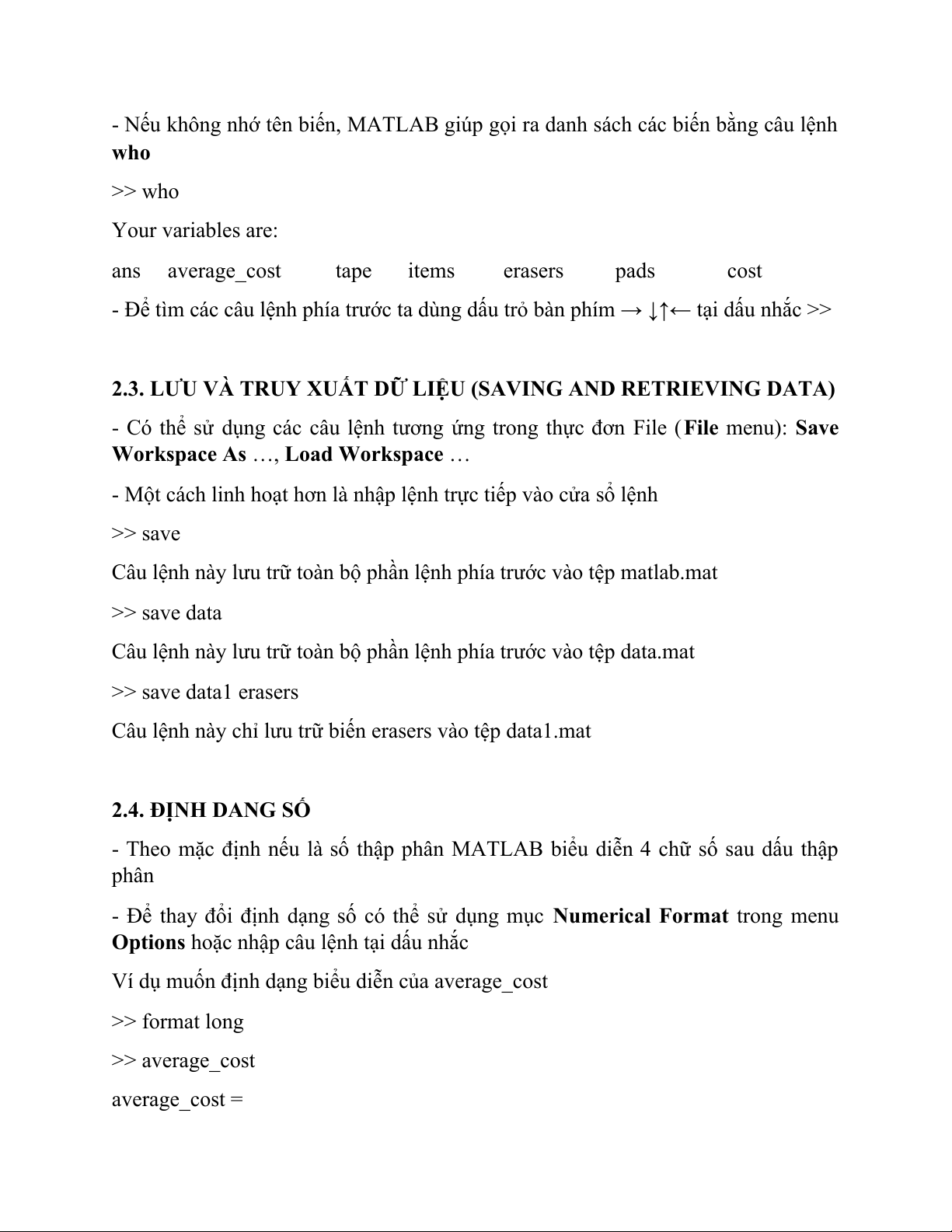 - Nếu không nhớ tên biến, MATLAB giúp gọi ra danh sách các biến bằng câu lệnh who >> who Your variables are: ans average_cost tape items erasers pads cost