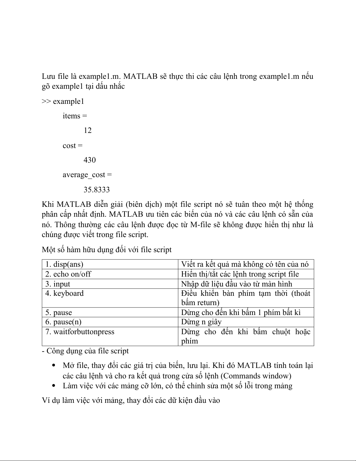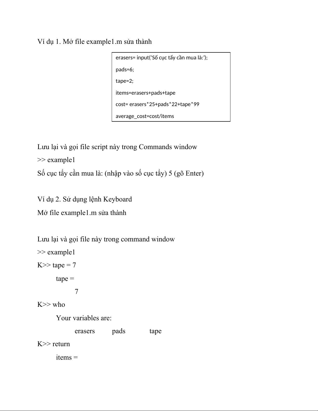 gõ example1 tại dấu nhắc >> example1 items = 12 cost = 430 average_cost = 35.8333