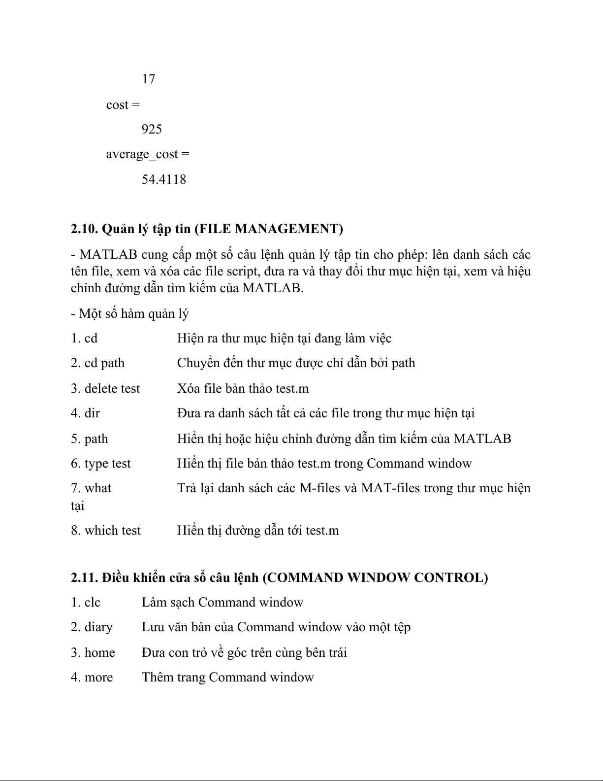 2.11. Điều khiển cửa sổ câu lệnh (COMMAND WINDOW CONTROL) 1. clc Làm sạch Command window 2. diary