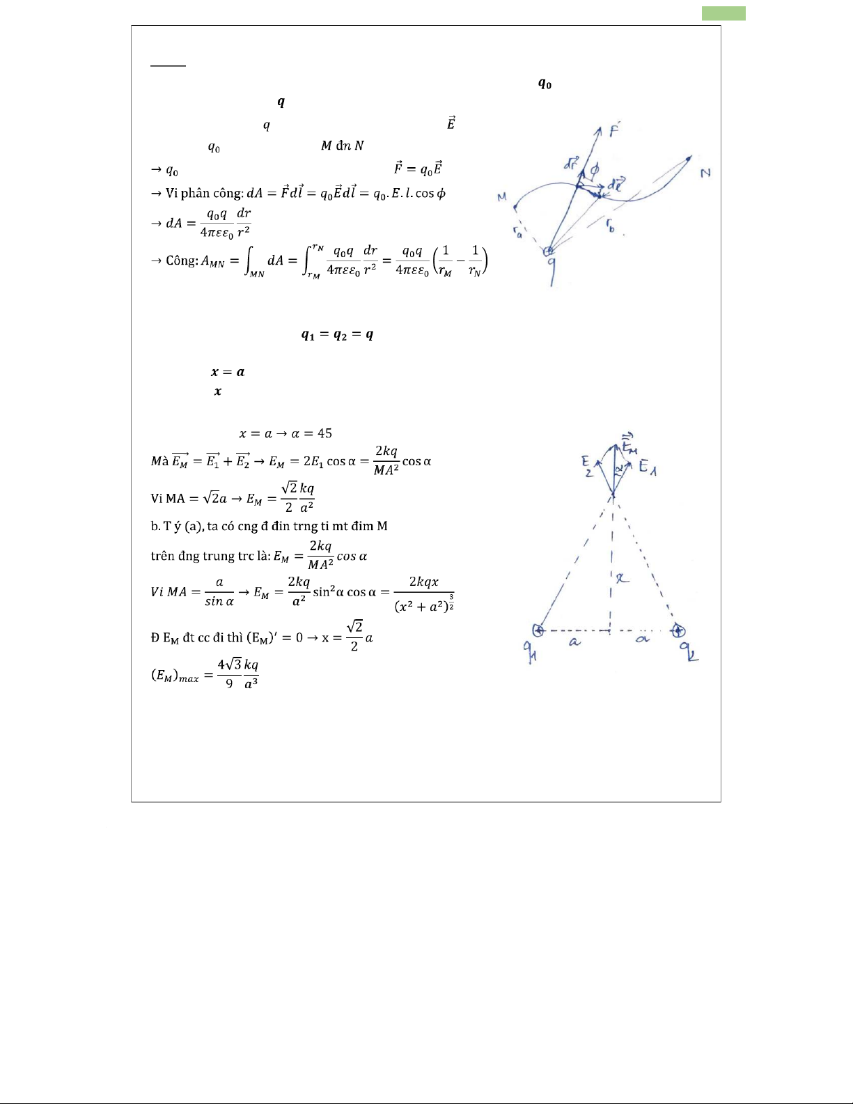 1. Tính công của lực tĩnh điện khi dịch chuyển điện tích điểm trong điện trường của