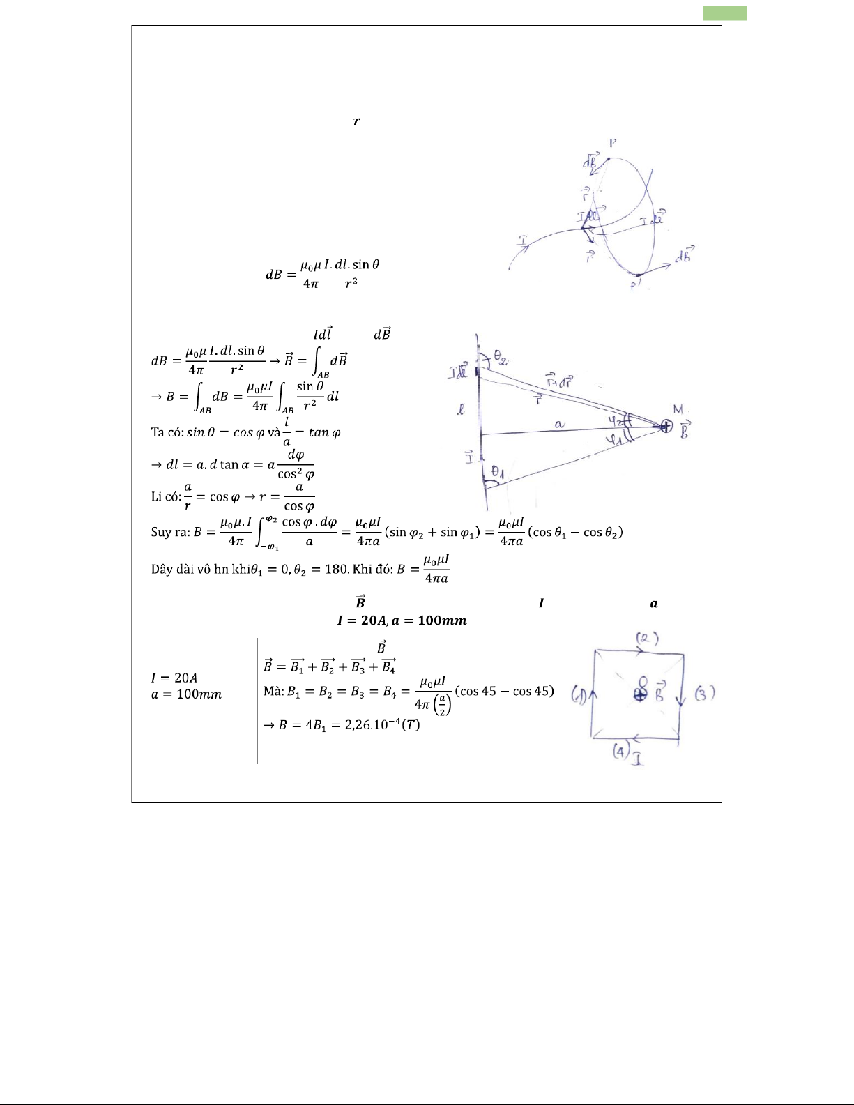 2. Xác định vector cảm ứng từ tại tâm O của một dòng điện hình vuông, cạnh , đặt trong không khí. Cho biết Dòng điện hình