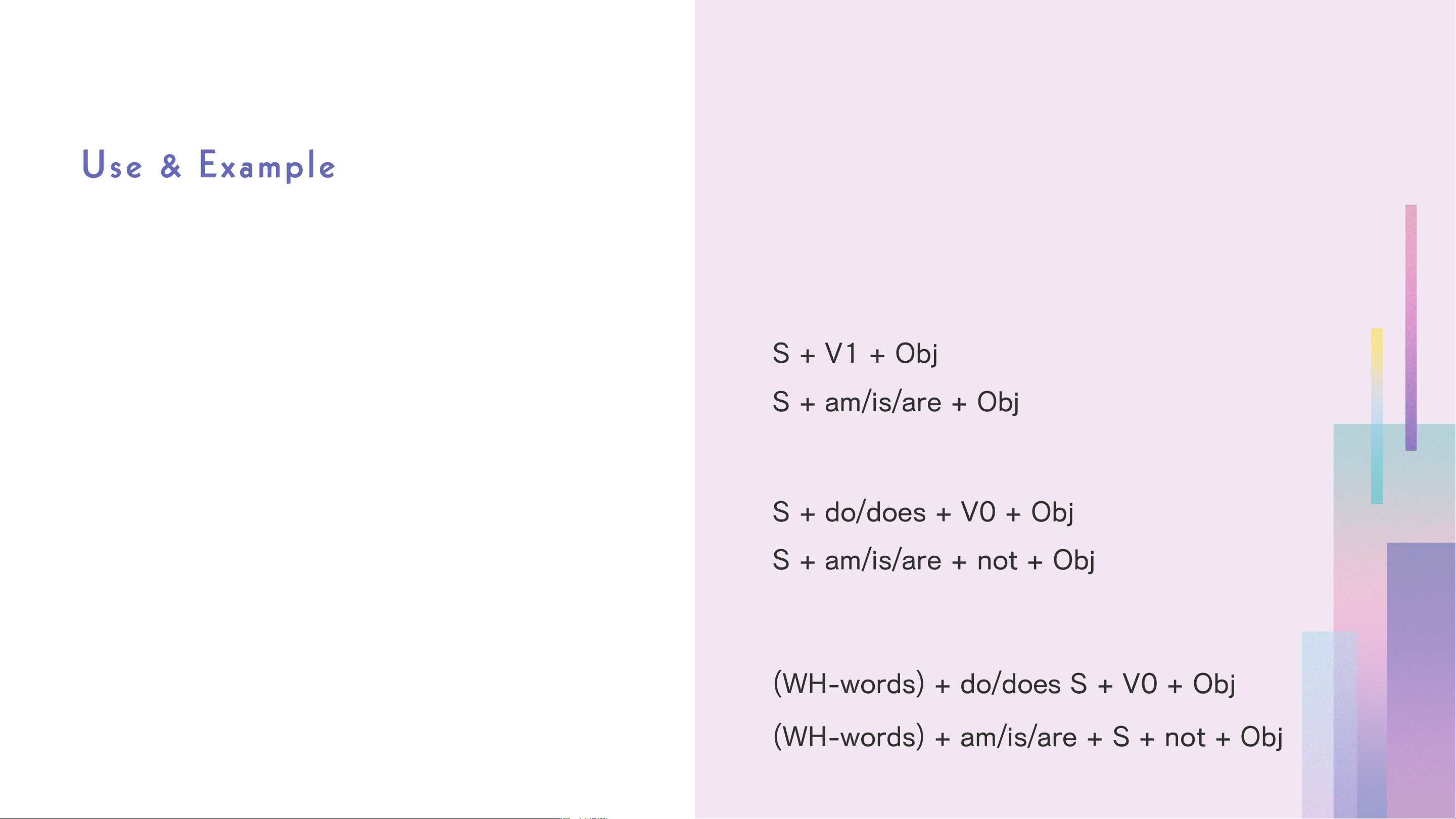 EX: Taylor studies in Tran Van Quan high S+do/does+V0+Obj school. S+am/is/are+not+Obj 4. States Question Ex:Wecloselyresembleourmother. (WH-words)+do/doesS+V0+Obj 5. Generaltruthsandfacts (WH-words)+am/is/are+S+not+Obj Ex:PhuQuocislandisinVietnam. Watch out!