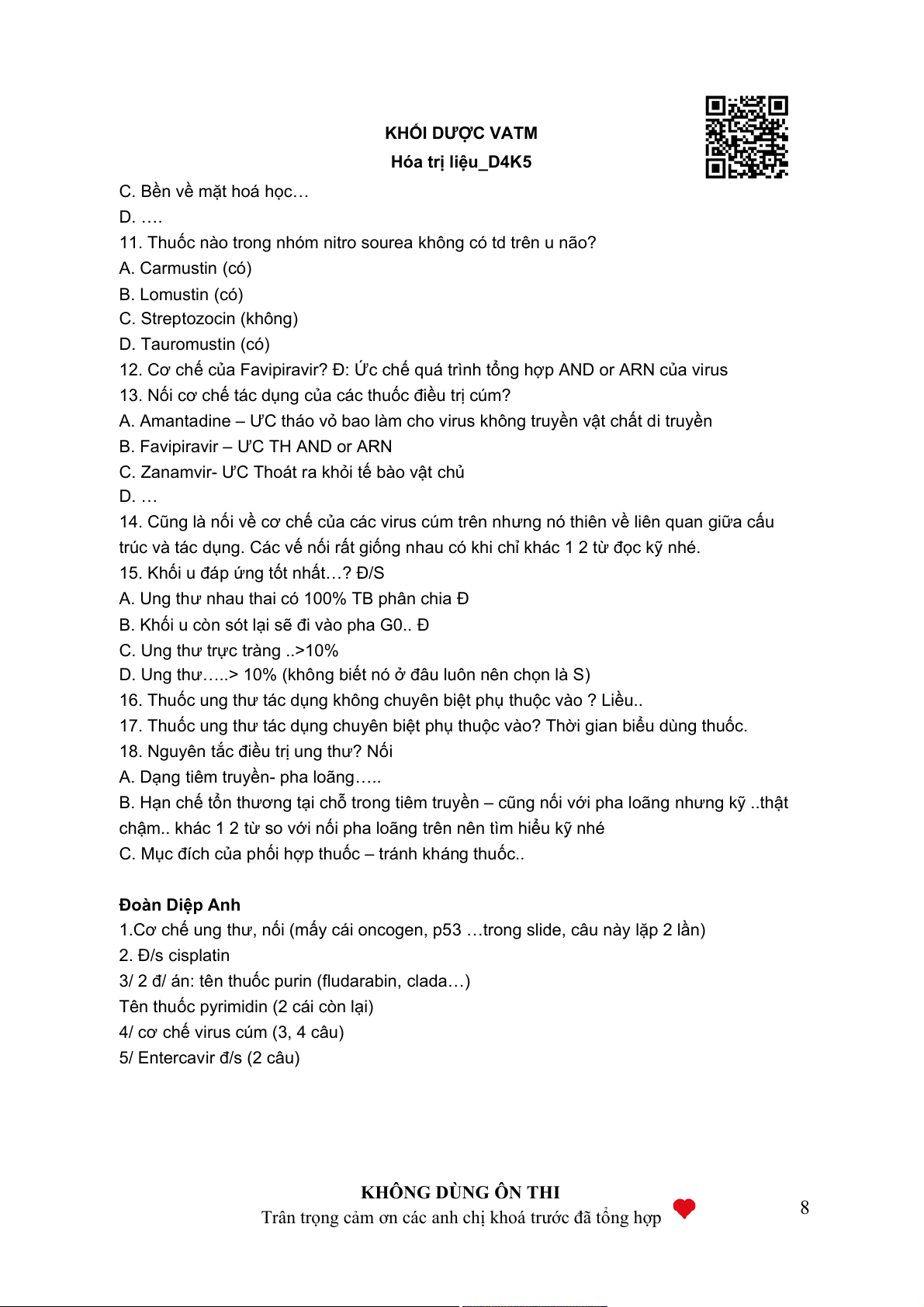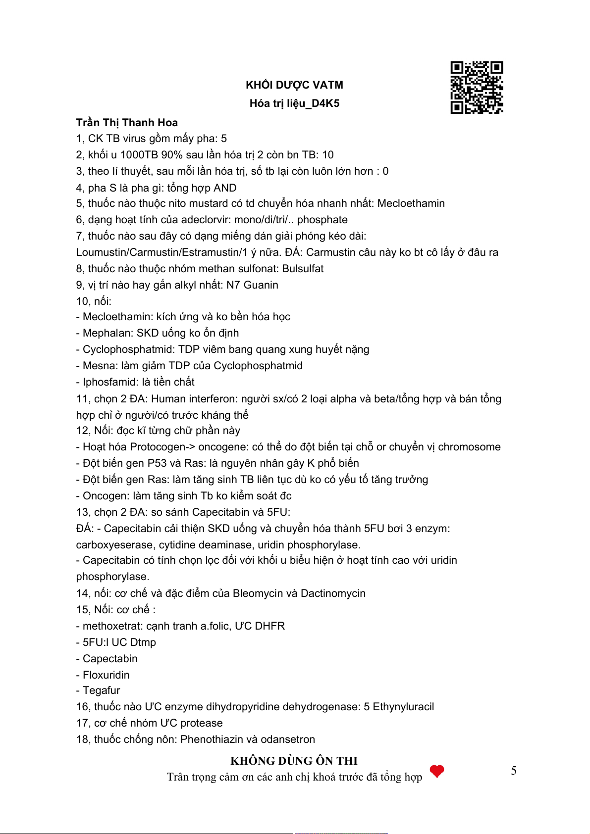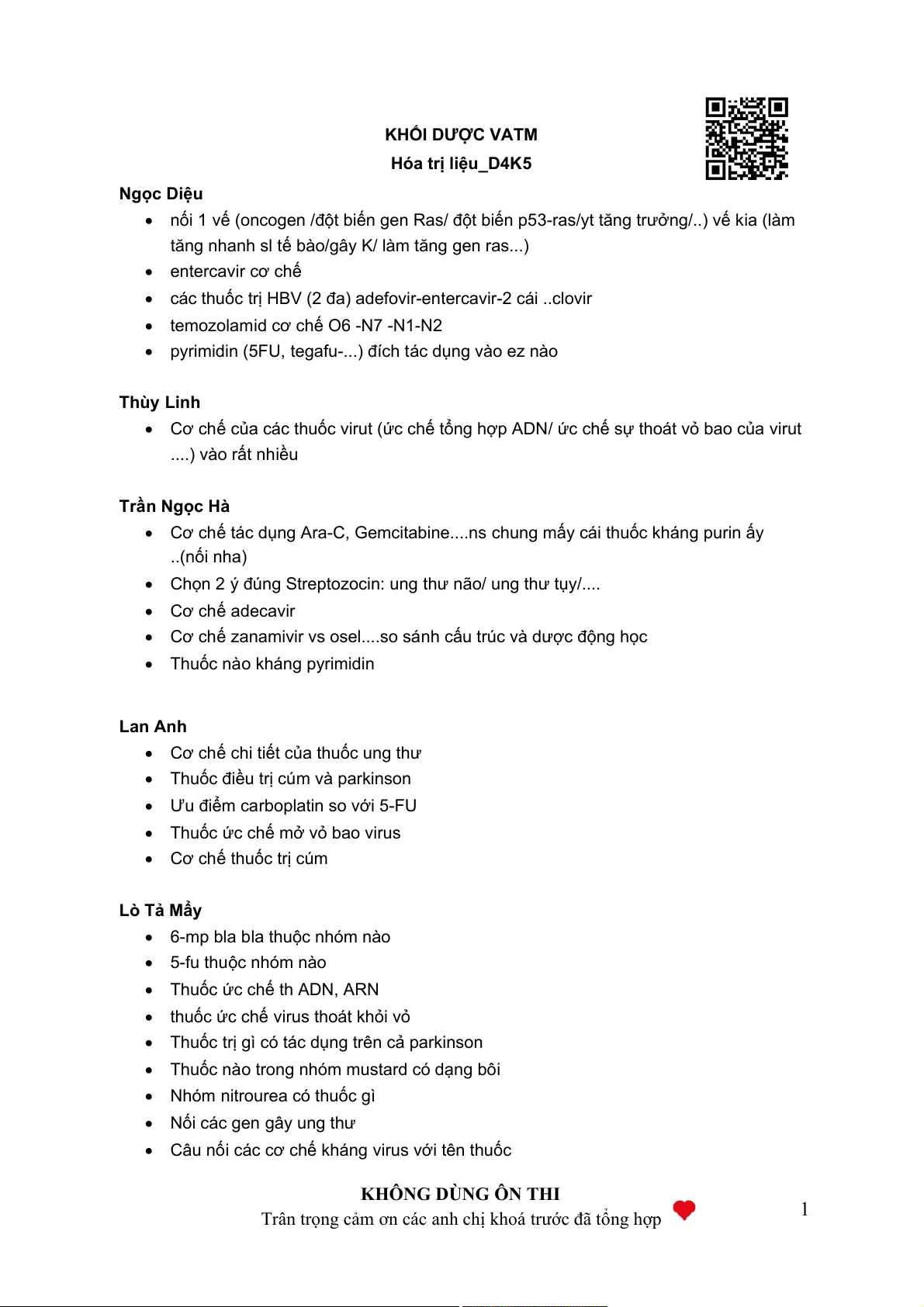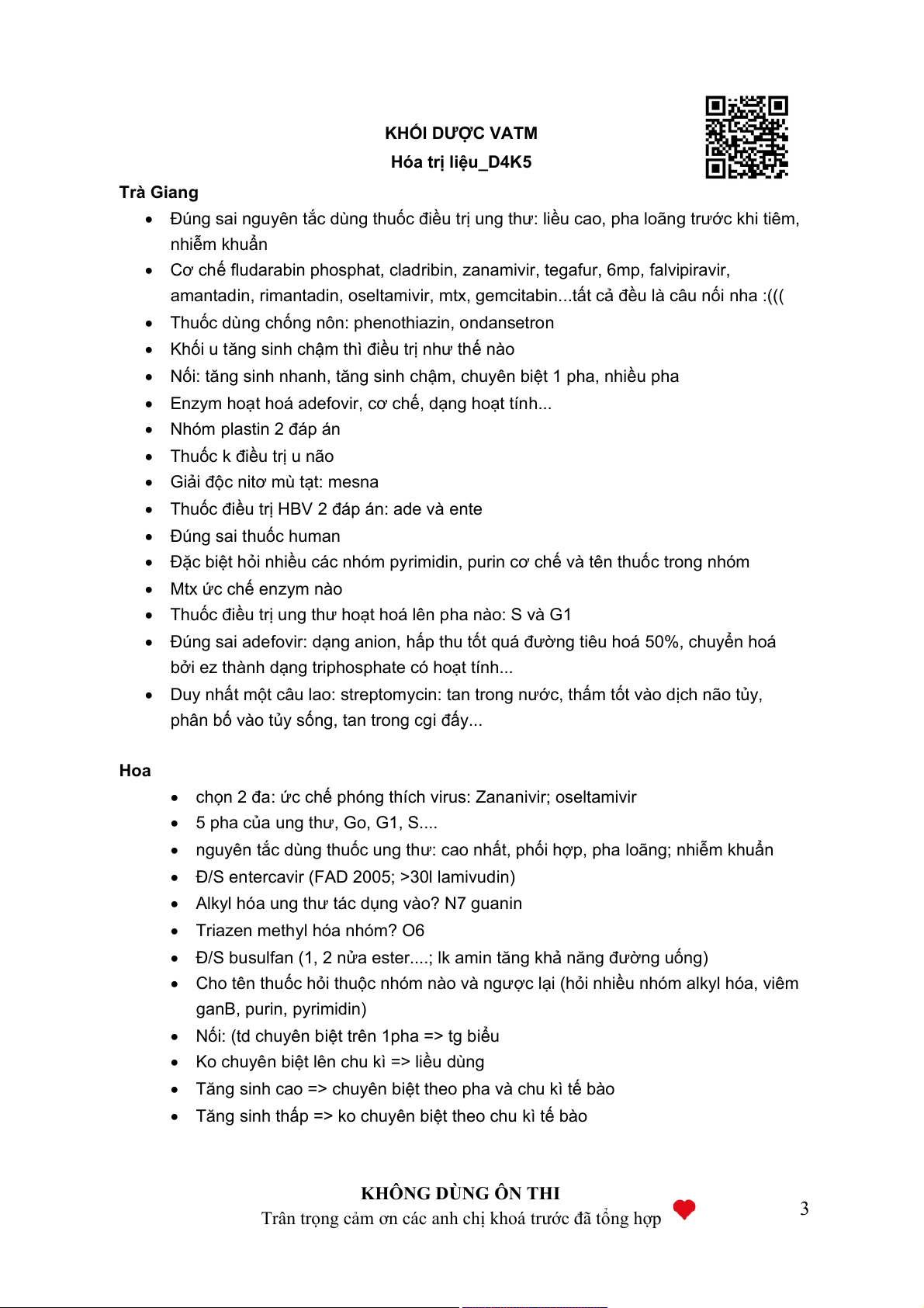 Trân trọng cảm ơn các anh chị khoá trước đã tổng hợp KHỐI DƯỢC VATM Hóa trị liệu_D4K5 Thao Nguyen