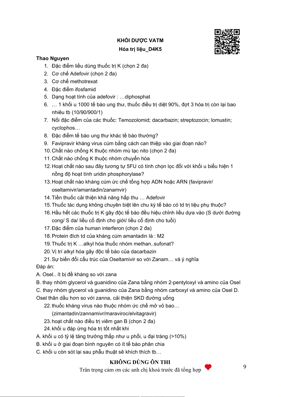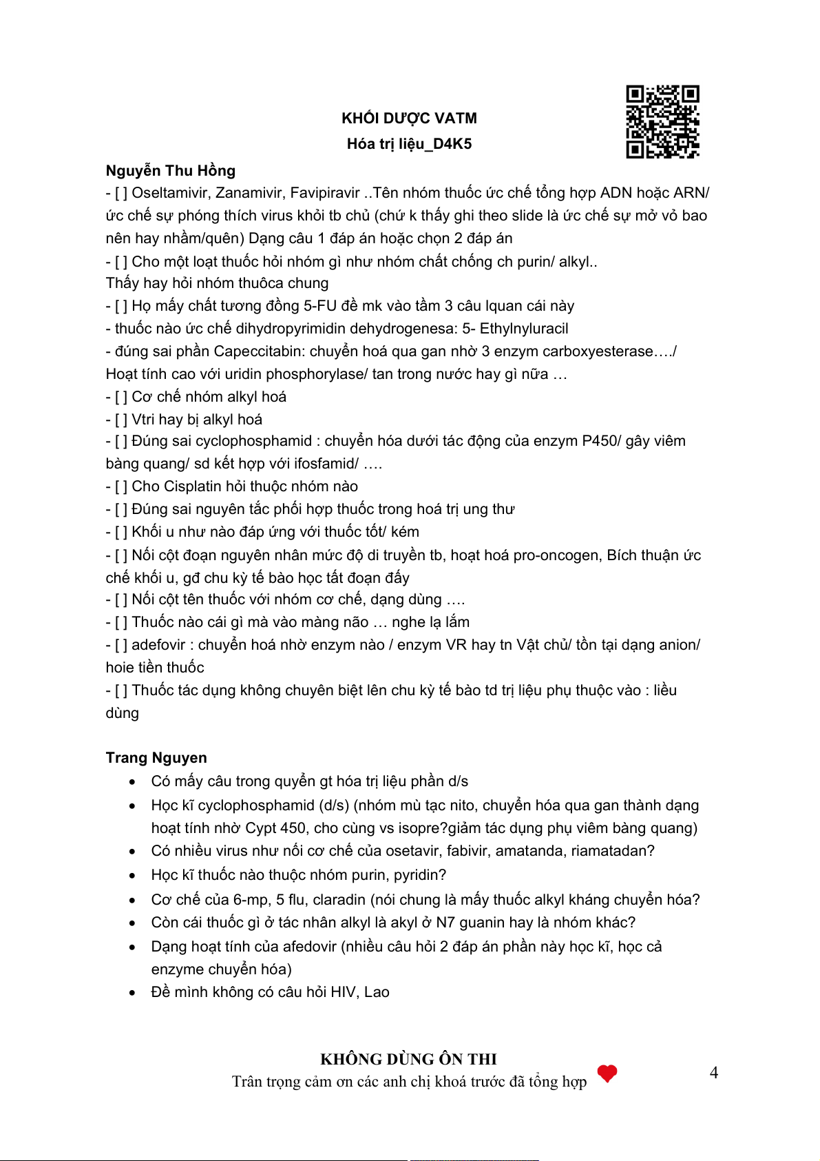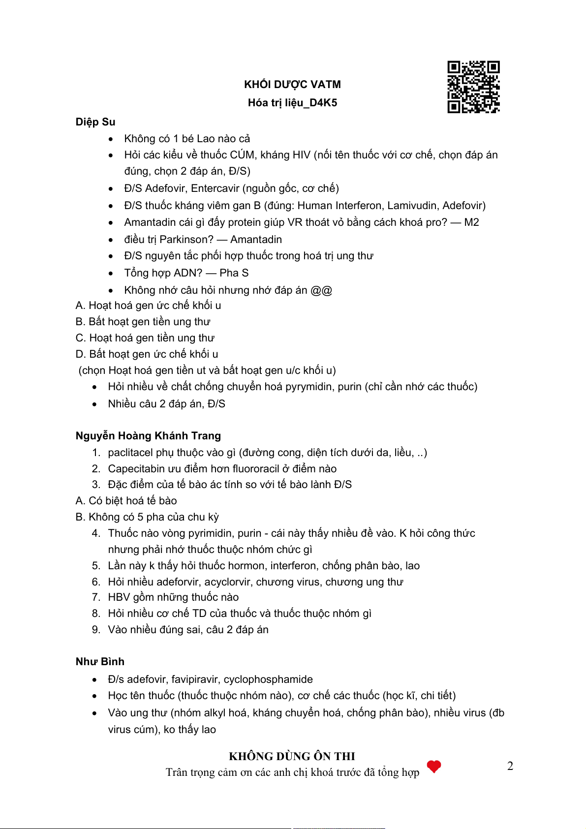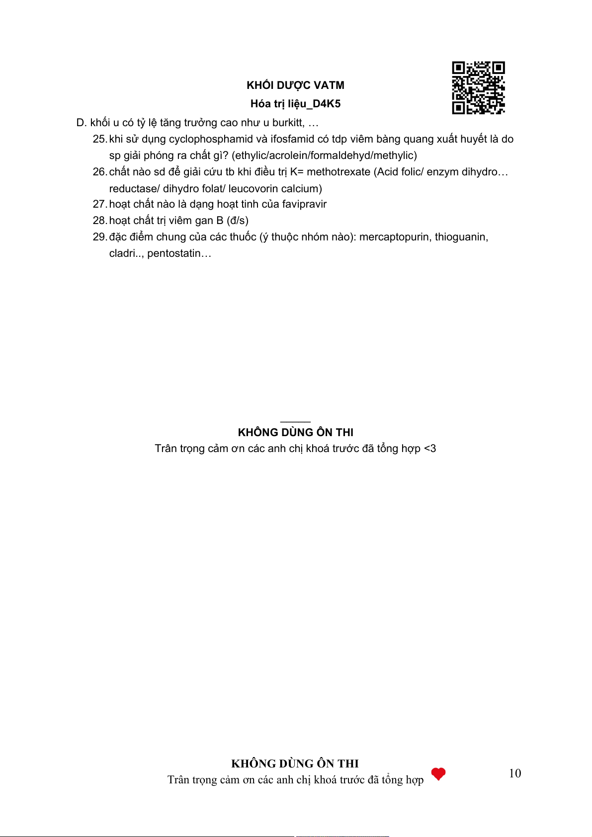 Trân trọng cảm ơn các anh chị khoá trước đã tổng hợp KHỐI DƯỢC VATM Hóa trị liệu_D4K5 Thao Nguyen