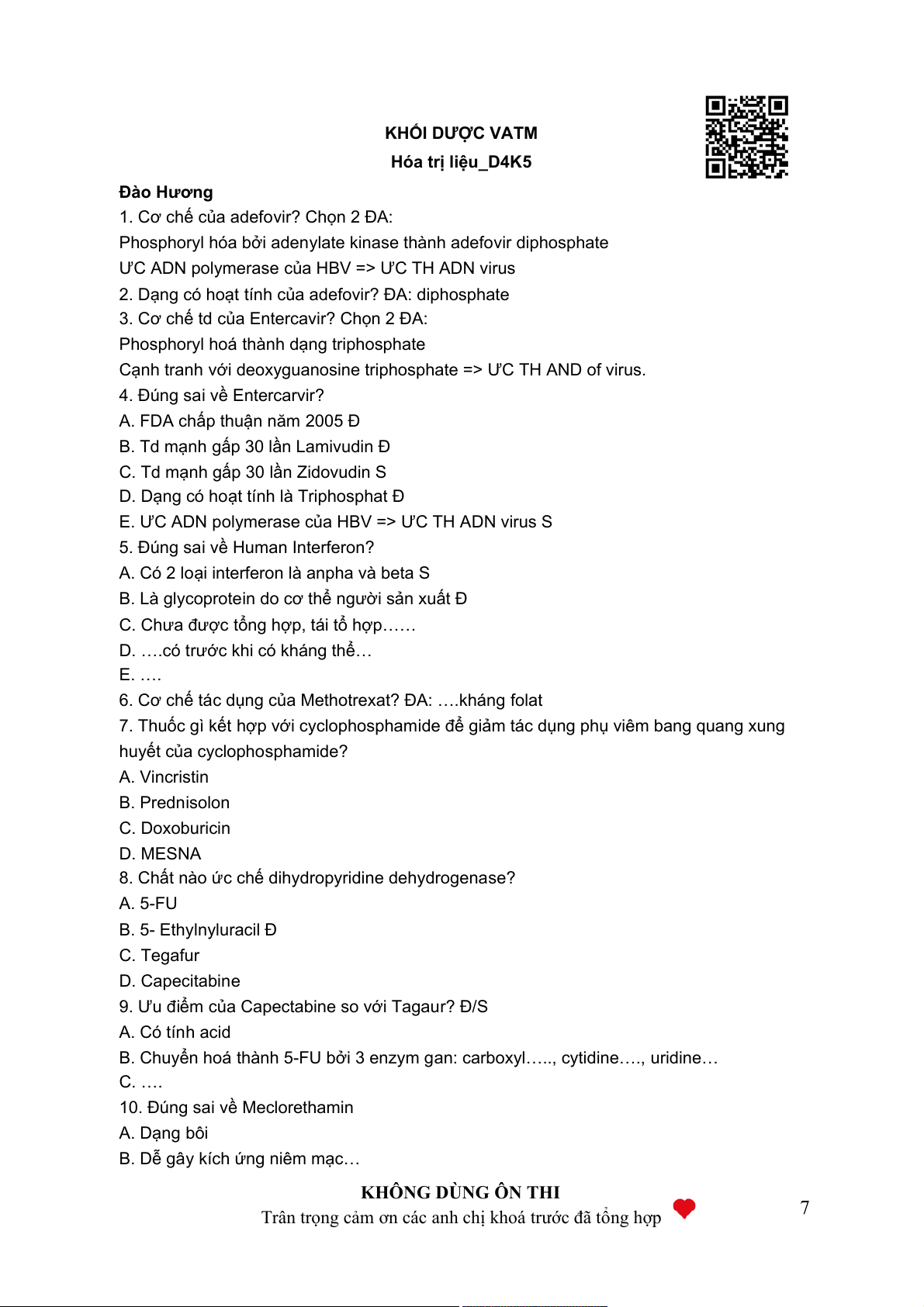 Trân trọng cảm ơn các anh chị khoá trước đã tổng hợp KHỐI DƯỢC VATM Hóa trị liệu_D4K5 Đào Hương
