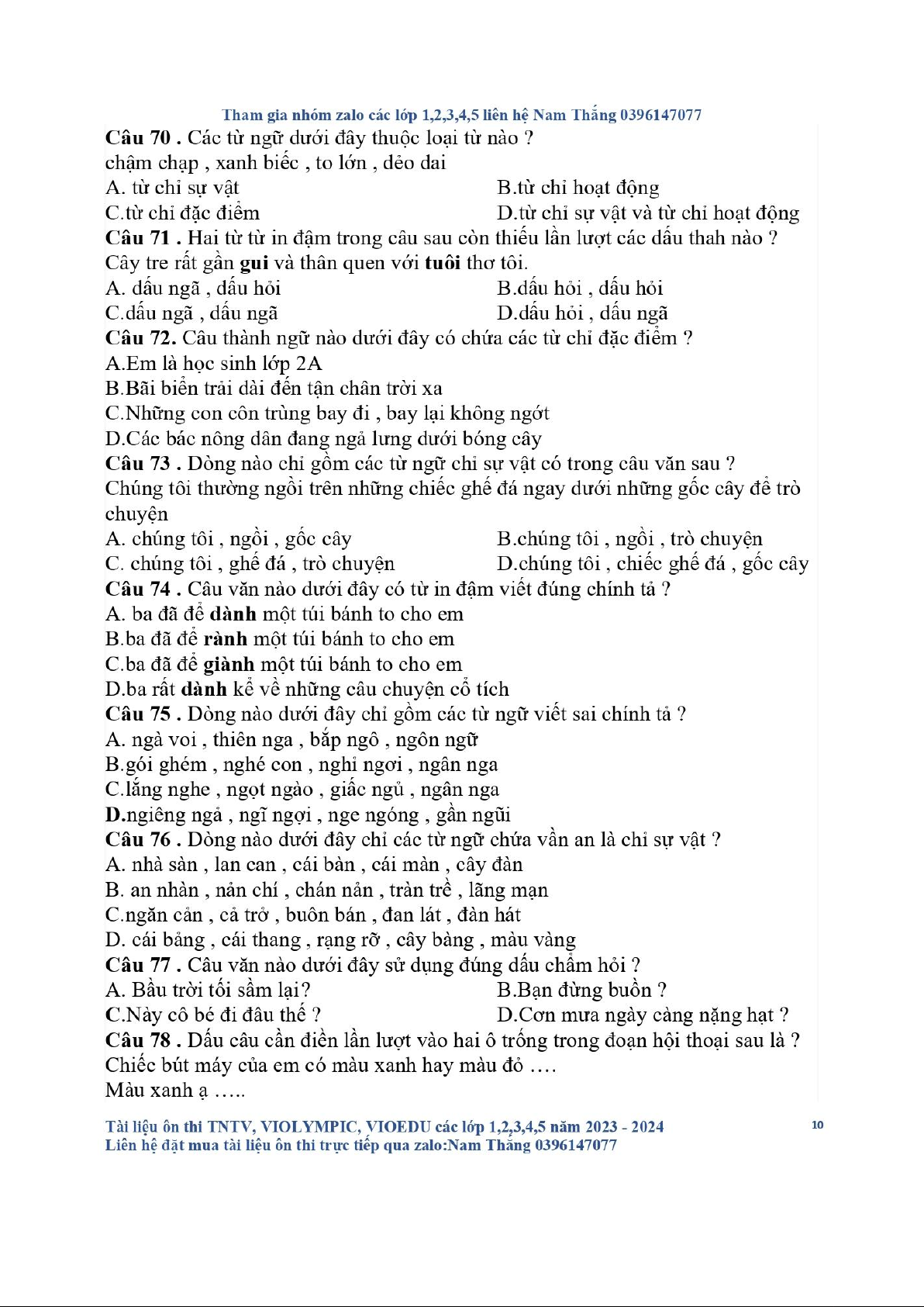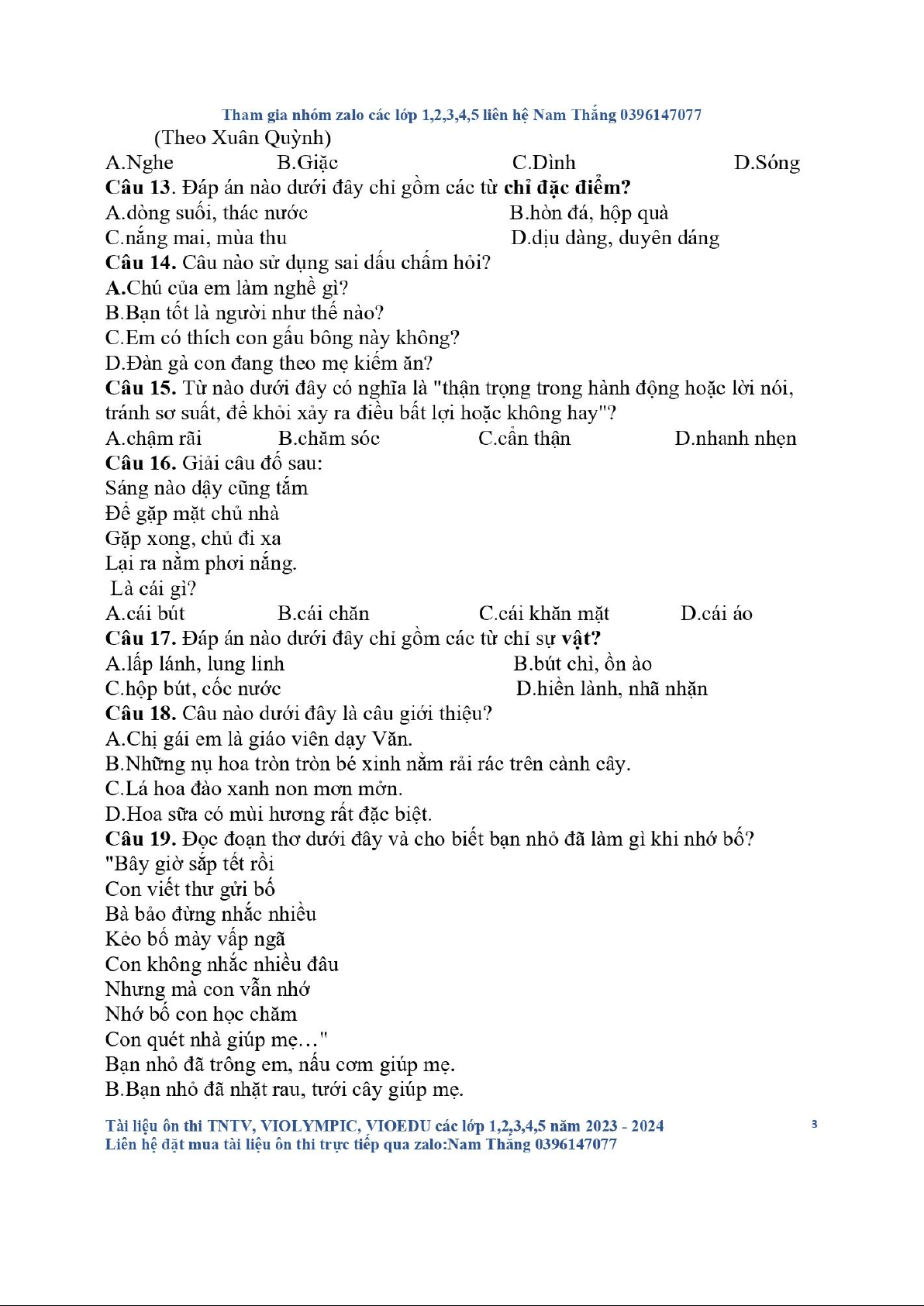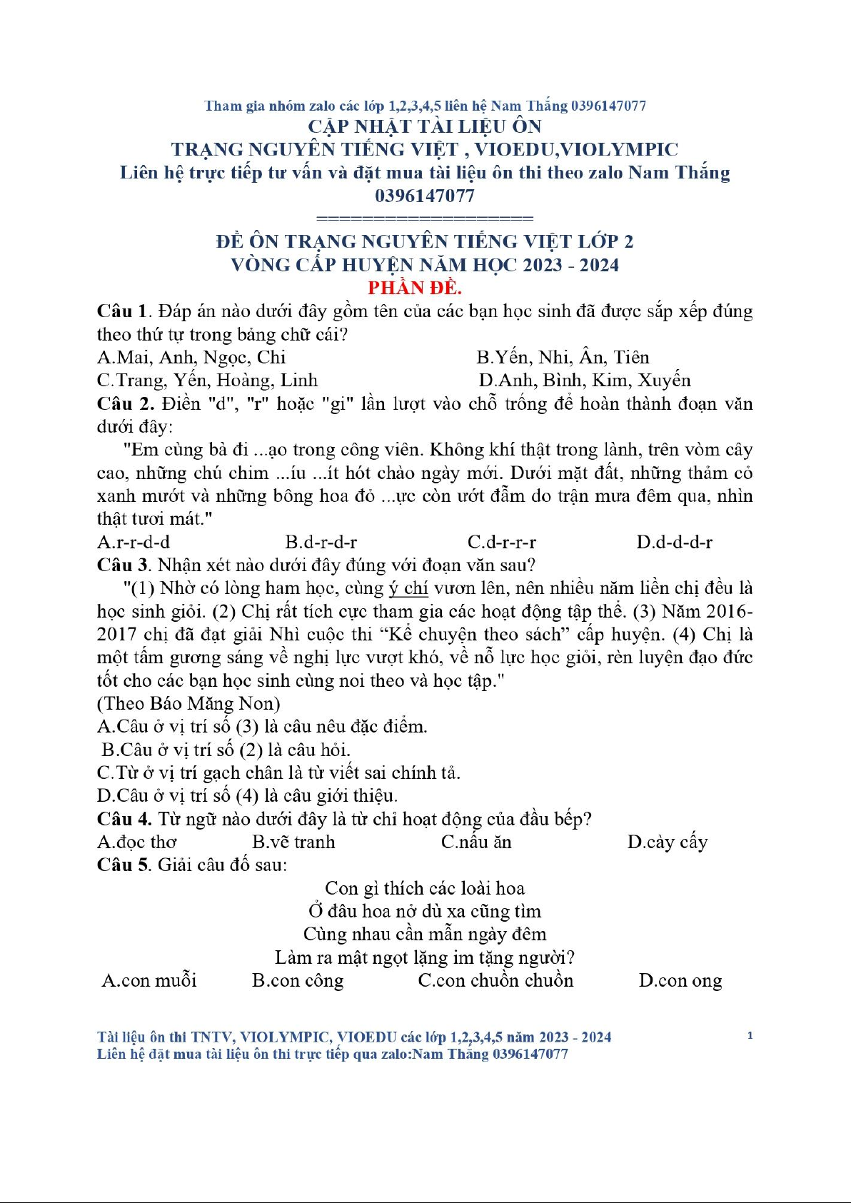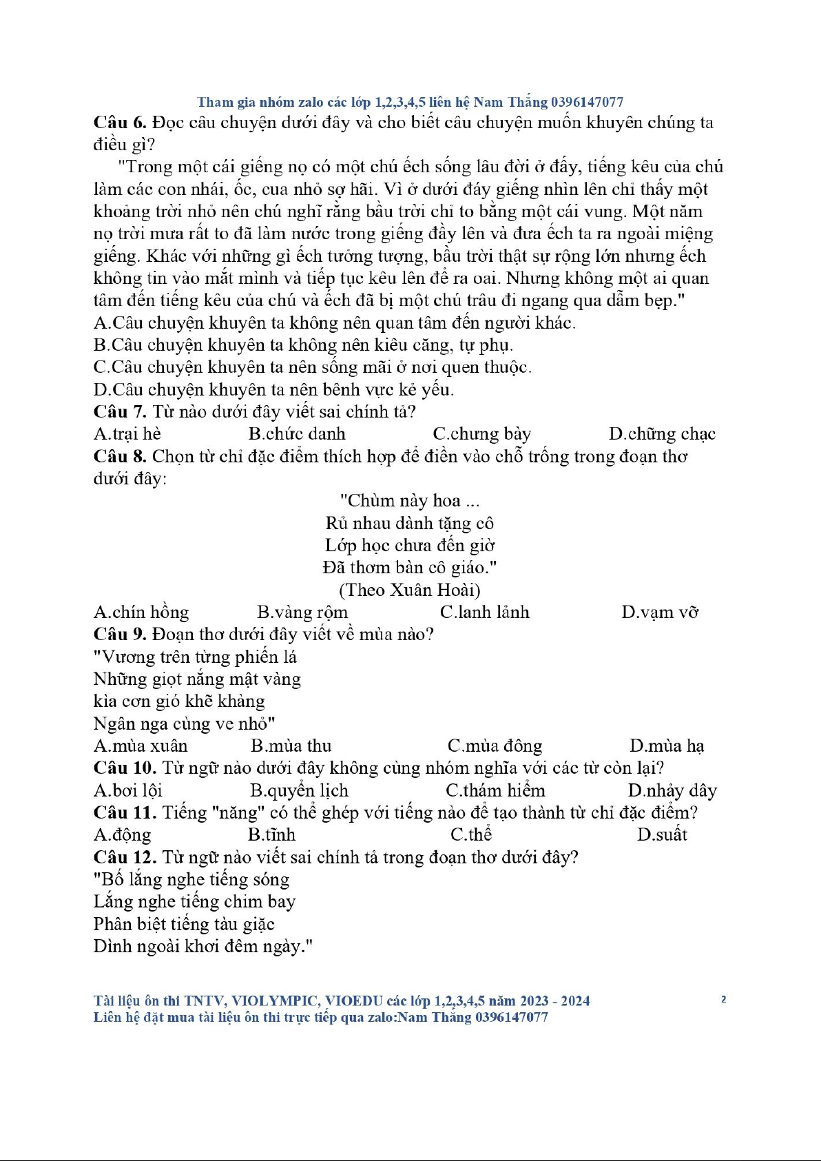 Tài liệu ôn thi trạng nguyên, vioedu lớp 2 cấp Huyện