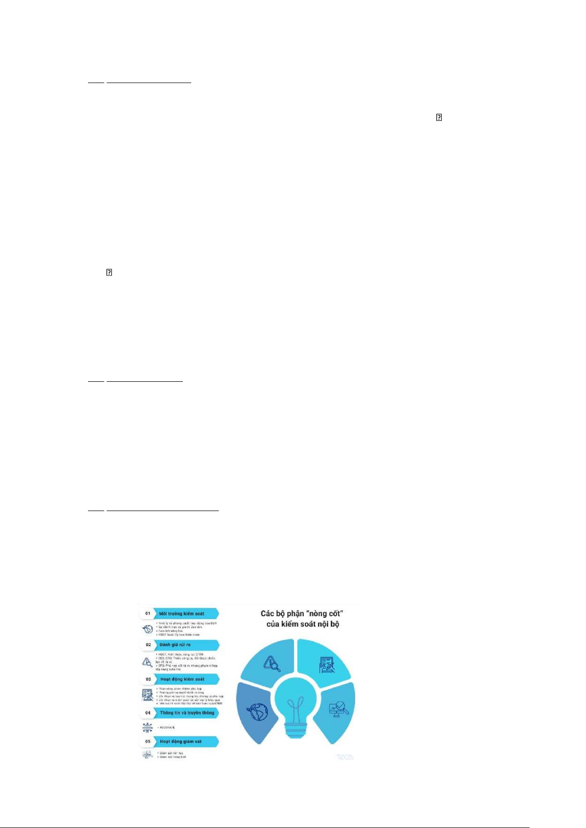 Kiểm soát nội bộ bao gồm 5 thành phần: môi trường kiểm soát, đánh giá rủi ro, hoạt động