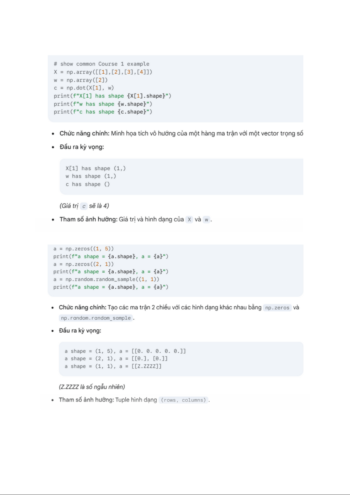 Chức năng chính: Nhân ma trận (np.dot). Đầu ra kỳ vọng: