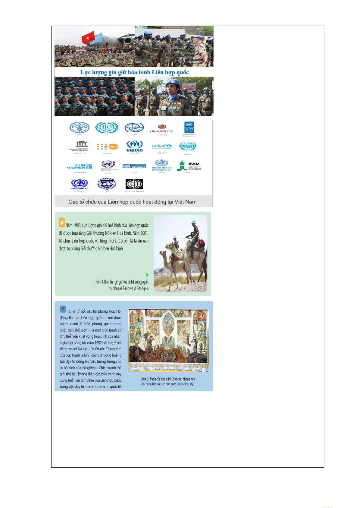 Nhiệm vụ 2: Trả lời cá nhân ? Đọc thông tin tư liệu và quan sát các hình từ 4 đến 7. Cho biết trong các vai trò của Liên hợp quốc em ấn tượng với vai trò nào? vì sao? B2: Thực hiện nhiệm vụ GV hướng dẫn HS trả lời HS: Quan sát ngữ liệu trong SGK để trả lời câu hỏi. GV hướng dẫn HS thảo luận GV cung cấp thông tin hình ảnh