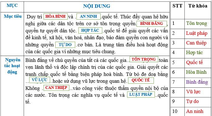 Vòng 2: Sắp xếp các từ khoá vào các lĩnh vực tương ứng thể hiện về mục tiêu và nguyên tắc hoạt động của Liên hợp quốc