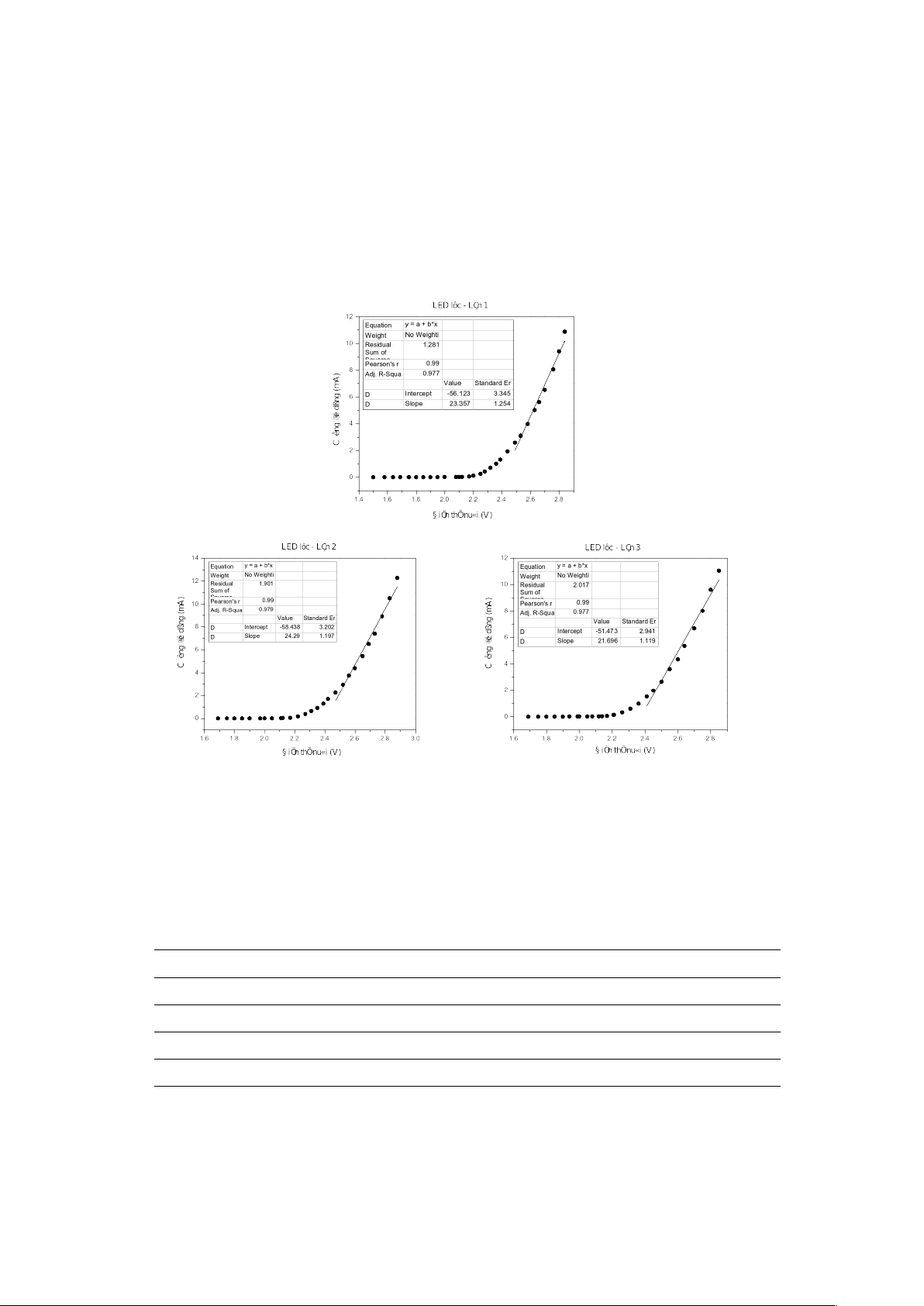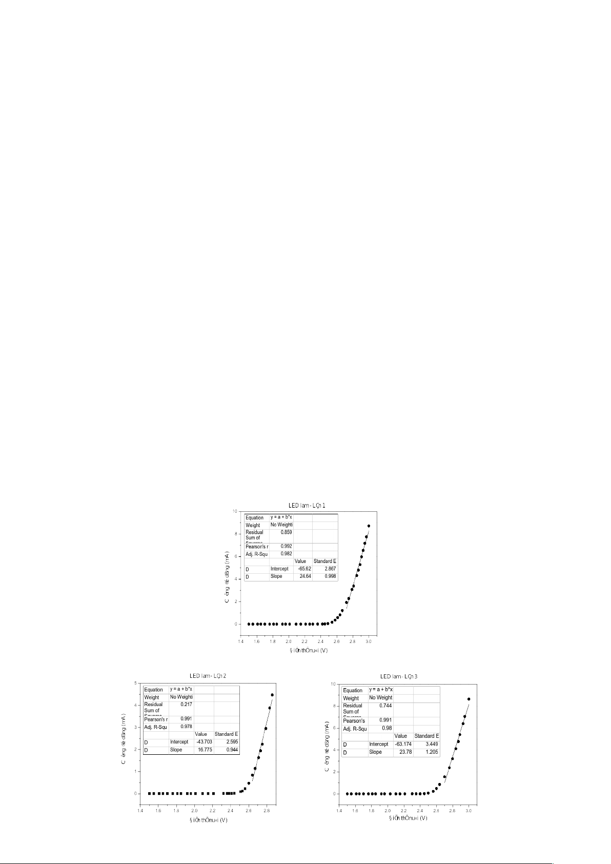 Bảng 1. Kết quả đo đặc trưng V-A của LED phát sáng màu lam. Lần 1 Lần 2 Lần 3 U(V) I(mA) U(V) I(mA) U(V) I(mA) 1,50 0 1,50 0 1,50 0 1,55 0 1,55 0 1,55 0 1,61 0 1,61 0 1,61 0 1,65 0 1,65 0 1,65 0 1,70 0 1,70 0 1,70 0 3. KẾT QU 1,76 Ả VÀ THẢ 0 O LUẬN 1,76 0 1,76 0 3.1. Kết qu
