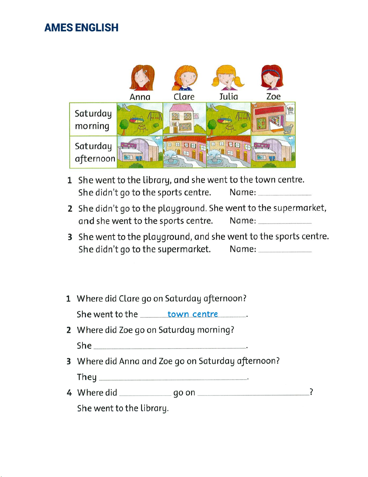 3. Read questions and answers about a town centre. Draw lines.
