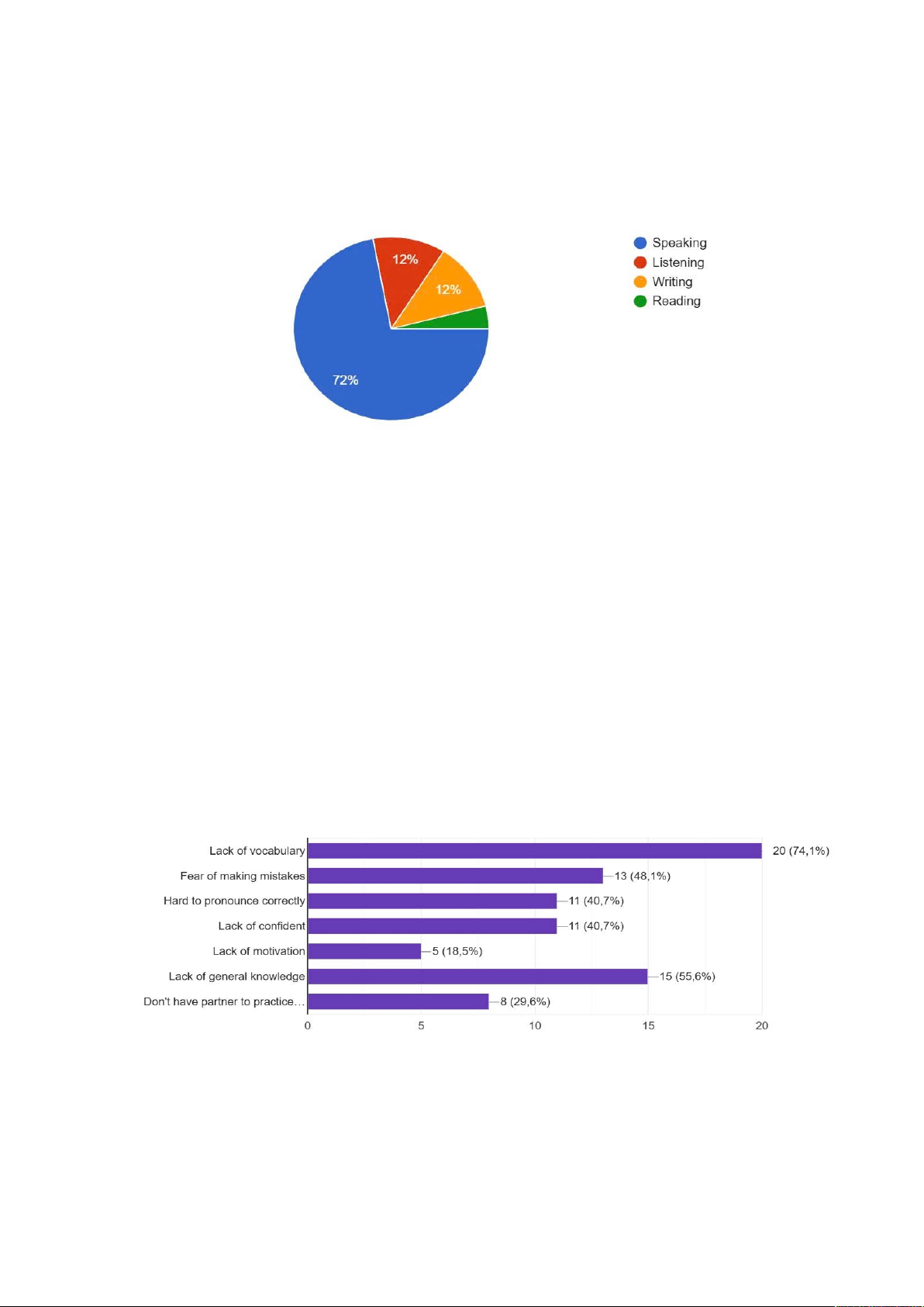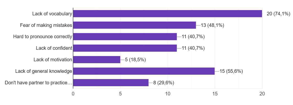The bar chart displays the problems faced by first-year students in English speaking skills. Fear of making mistakes (48,1%) suggests that a significant portion of students may feel inhibited or anxious about speaking in English due to the fear of making errors. Many students may lack of confident (40,7%) needed to communicate effectively in English, which could hinder their speaking skills development. Many students (74,1%) struggle with vocabulary, indicating they may have difficulty finding the right words to express themselves effectively.