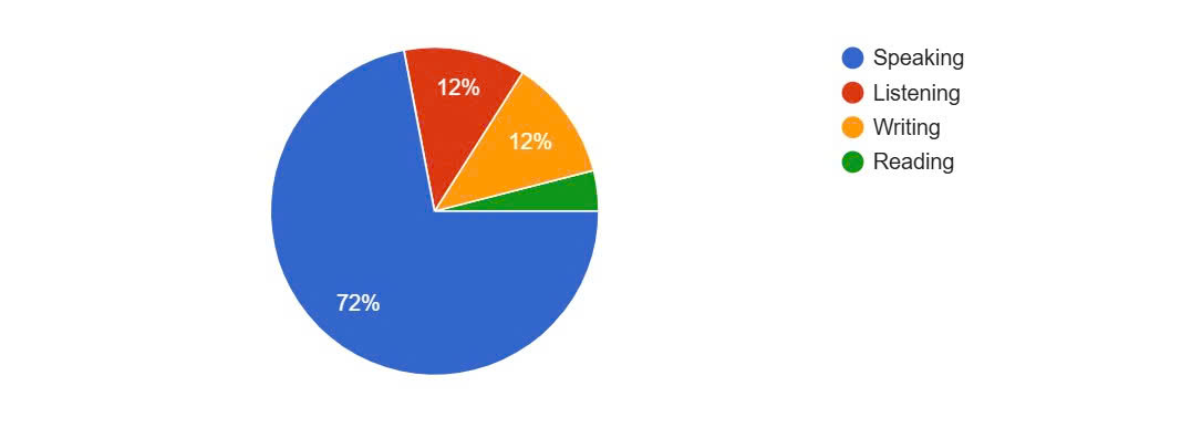 This pie chart illustrates that most respondents (72%) perceive speaking skills as important. The remaining three skills were selected by only 28% of them, implying that there's a strong consensus among the surveyed population regarding the significance of speaking skills.