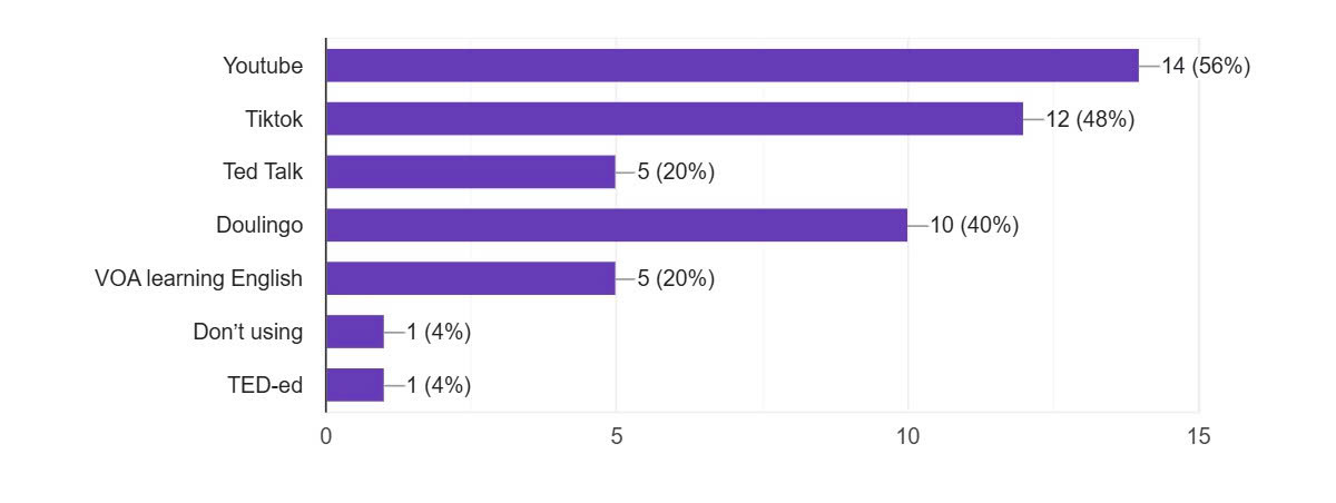 YouTube is the most popular platform for shadowing practice, with 14 (56%) of respondents using it. Its vast library of videos, including movies, TV shows, music videos, and educational content, makes it a versatile tool for practicing pronunciation and intonation.