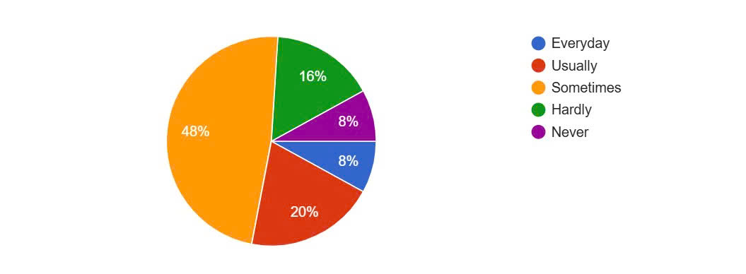 The pie chart presents data on the frequency with which individuals employ the shadowing technique in their language learning endeavors. It reveals that a substantial majority of respondents, accounting for 48%, utilize the shadowing technique ‘sometimes’. This indicates that while shadowing is a recognized and valuable tool for language acquisition, it may not be a daily practice for many learners.