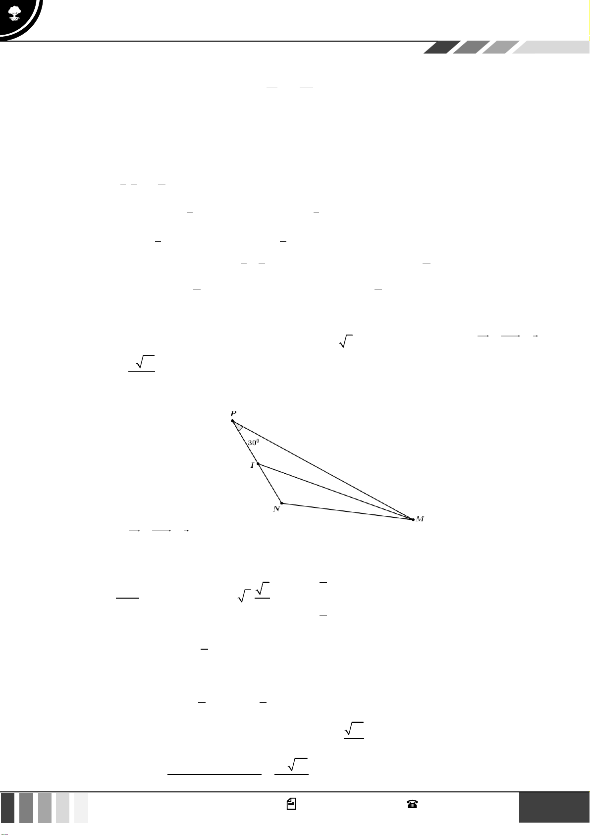 (1,0 điểm) Cho MNP có NPM = 30 và PM = a 3 . Gọi I là điểm thỏa mãn IP + 2IN = 0 và a 13 MI = . Tìm số đo PMN ? 3 Lời giải