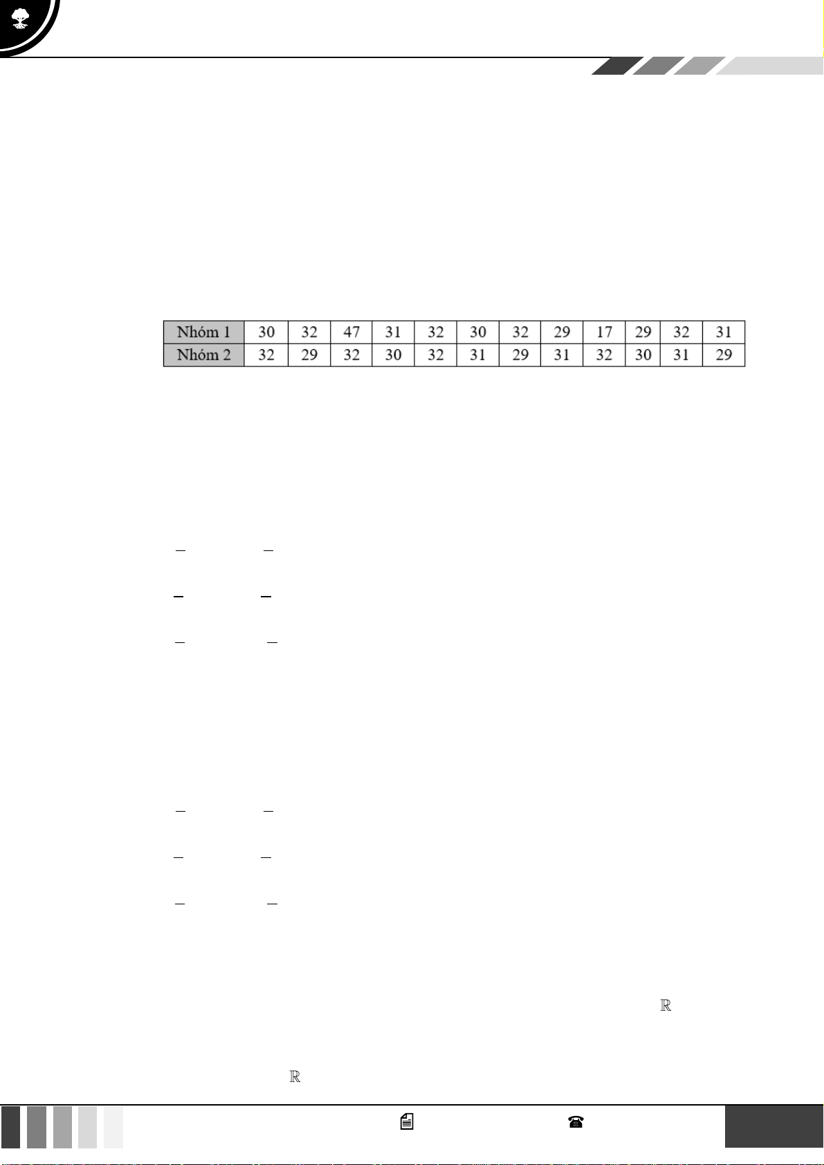 Khoảng tứ phân vị của 2 nhóm trên lần lượt là: A. 30; 3 . B. 3 ; 30 . C. 2,5 ; 2,5 . D. 6 ; 30 . 1 GV. Phan Nhật Linh - SĐT: 0817 098 716
