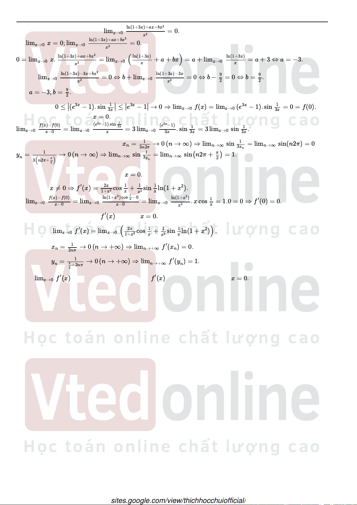 Câu 25 Ta cần tìm điều kiện để: lim ln(1+3x)+ax+bx2 x→0 = 0. x2 Có lim ln(1+3x)+ax+bx2 Suy ra: x→0 x = 0; limx→0 = 0. x2 0 = lim ln(1+3x)+ax+bx2 ln(1+3x) ln(1+3x) x→0 x. = limx→0 ( + a + bx) = a + limx→0 = a + 3 ⇔ a = −3. x2 x x Khi đó: lim ln(1+3x)−3x+bx2 ln(1+3x)−3x 9 9 x→0 = 0 ⇔ b + limx→0 = 0 ⇔ b − = 0 ⇔ b = . x2 x2 2 2 Vậy a = −3; b = 9 . 2 Câu 29 Có 0 ≤ ∣ 1 1 Vì ∣(e3x − 1). sin ∣