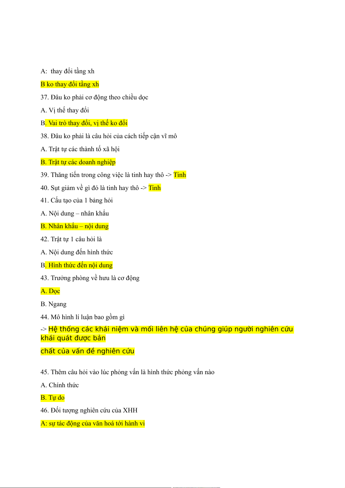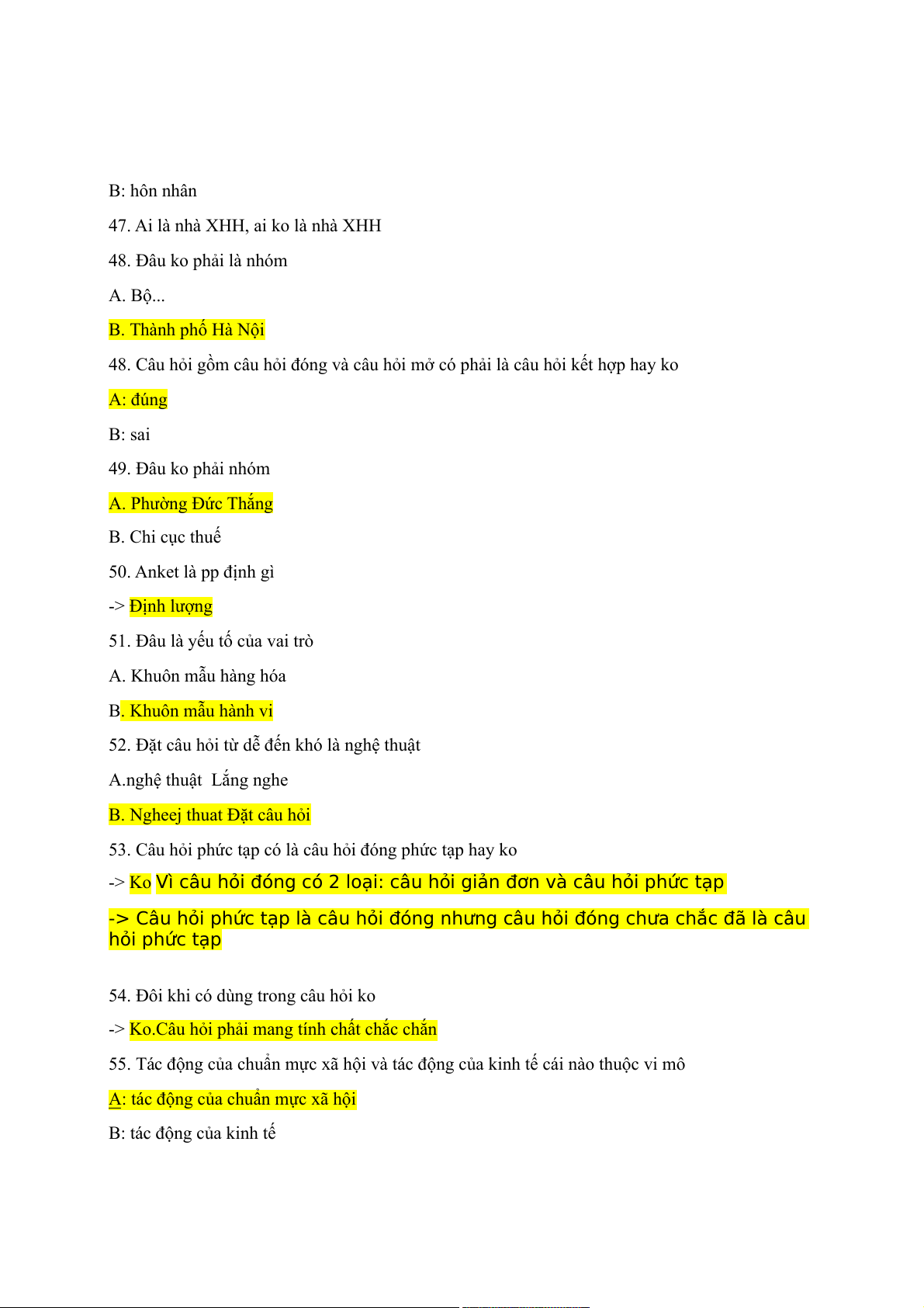 48. Câu hỏi gồm câu hỏi đóng và câu hỏi mở có phải là câu hỏi kết hợp hay ko A: đúng B: sai 49. Đâu ko phải nhóm A. Phường Đức Thắng B. Chi cục thuế 50. Anket là pp định gì -> Định lượng