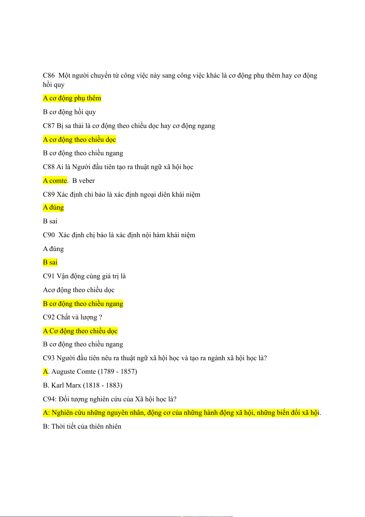 C93 Người đầu tiên nêu ra thuật ngữ xã hội học và tạo ra ngành xã hội học là? A. Auguste Comte (1789 - 1857) B. Karl Marx (1818 - 1883)