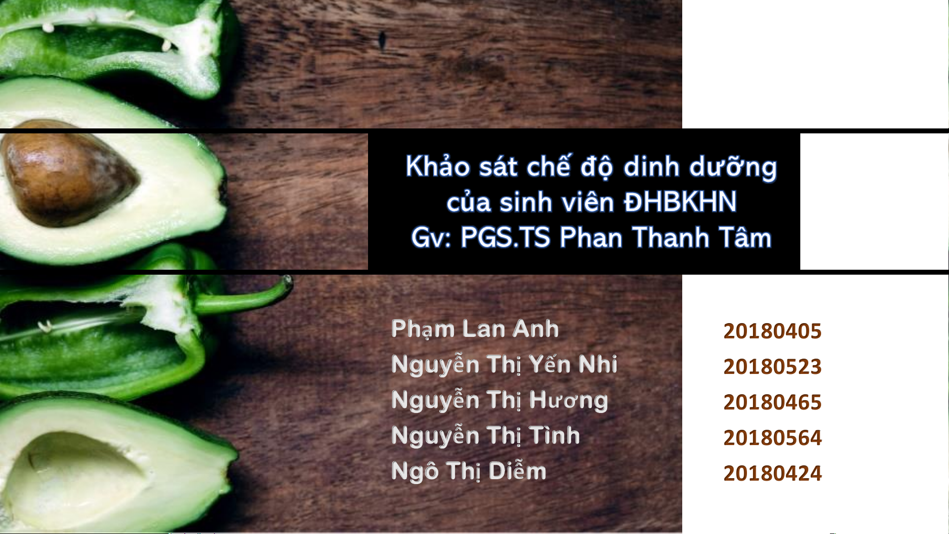 Nguyễn Thị Yến Nhi 20180523 Nguyễn Thị Hương 20180465 Nguyễn Thị Tình 20180564 Ngô Thị Diễm 20180424 Cơ sở Mục Xử lý Khảo lý Lời tiêu kết thuy sát ết khuyên quả Mục tiêu Khảo sát , đánh giá kiến thức dinh dưỡng,