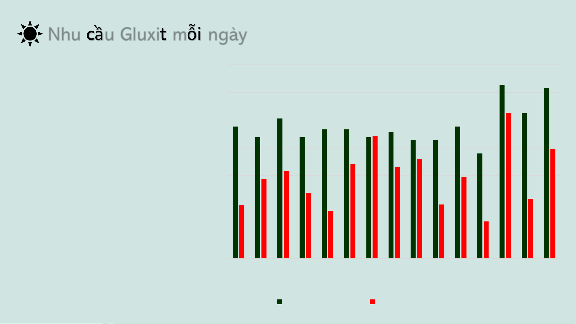 có tỷ lệ đáp ứng lipit 40 < 85%. 20 0 1 2 3 4 5 6 7 8 9 10 11 12 13 14 15 tỷ lệ đáp ứng lipit đủ Nhu cầu Gluxit mỗi ngày 350 ✓ Năng lượng do gluxit 300 cung cấp từ 56-70% 250 năng lượng khẩu 200 ma phần ăn. g 150 ✓ 14/15 sinh viên có tỷ 100 lệ đáp ứng nhu cầu 50 về Gluxit < 85%. 0 1 2 3 4 5 6 7 8 9 10 11 12 13 14 15 STT sinh viên Nhu cầu lý tưởng