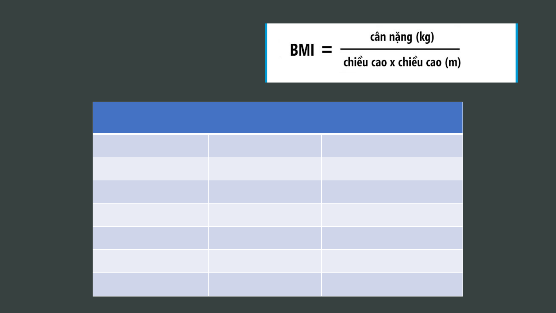 ạt động thể lực: Mức trung bình 40%CHCB Chỉ số BMI