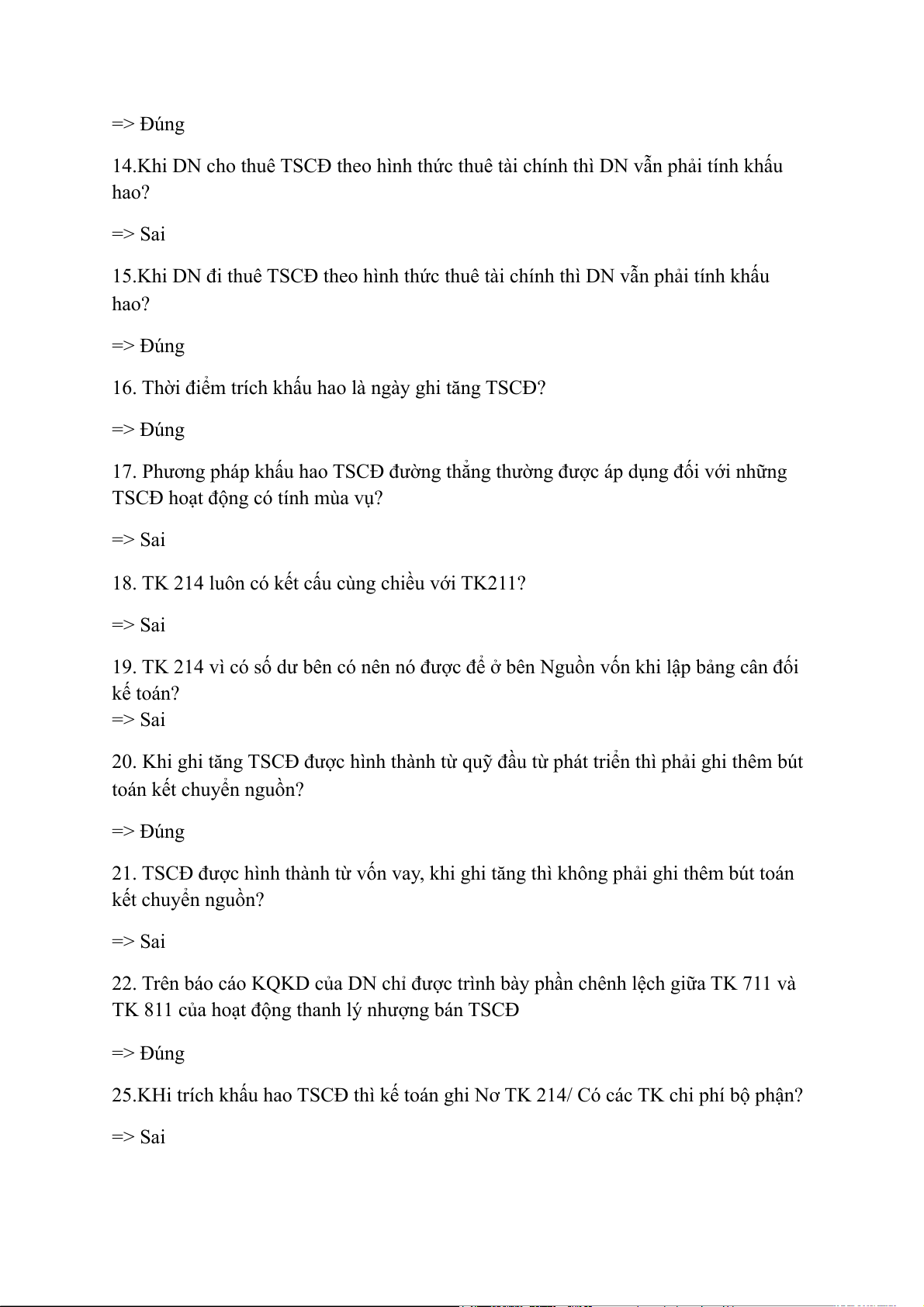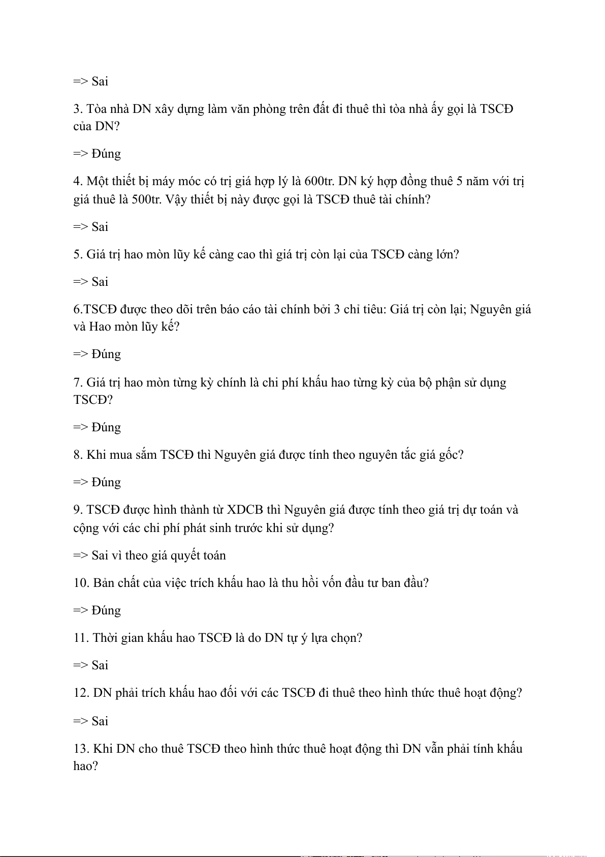 13. Khi DN cho thuê TSCĐ theo hình thức thuê hoạt động thì DN vẫn phải tính khấu hao? => Đúng