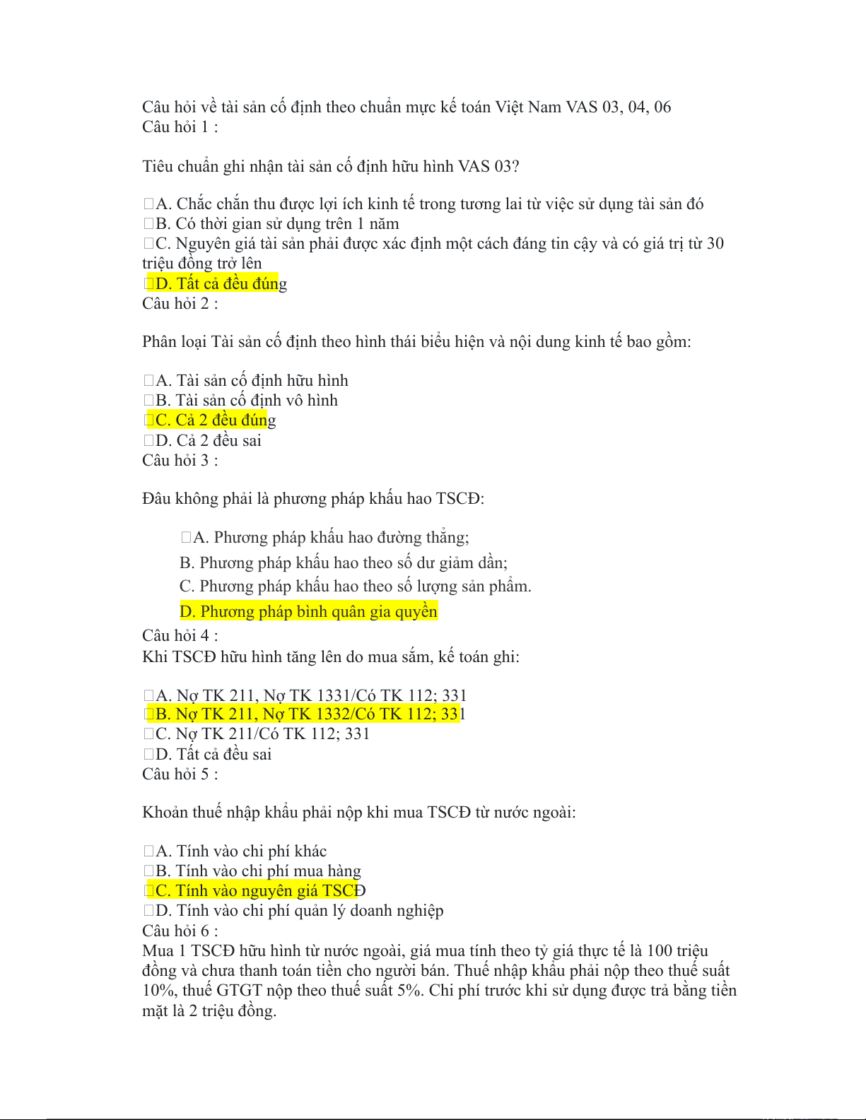 Câu hỏi về tài sản cố định theo chuẩn mực kế toán Việt Nam VAS 03, 04, 06 Câu hỏi 1 :