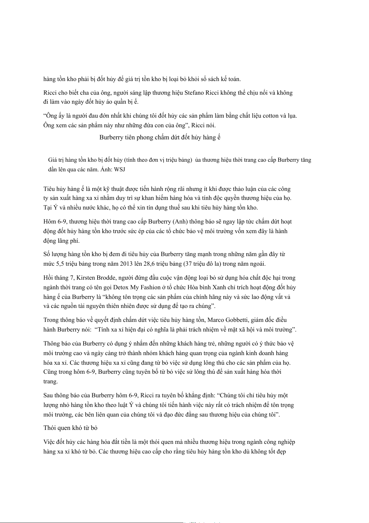 Ricci cho biết công ty ông cũng đốt hủy hàng không bán được ở Mỹ và Trung Quốc.