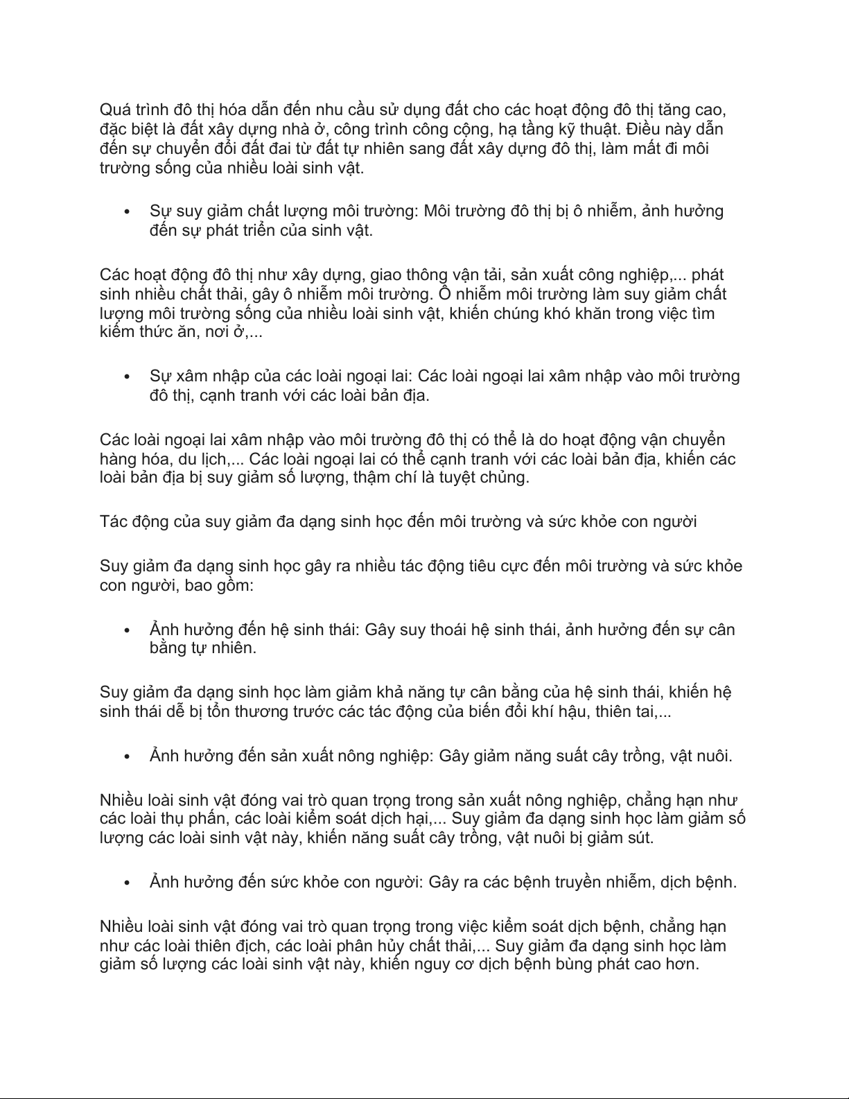 đặc biệt là ở các đô thị lớn. Các tác động của đô thị hóa đến đa dạng sinh học bao gồm: