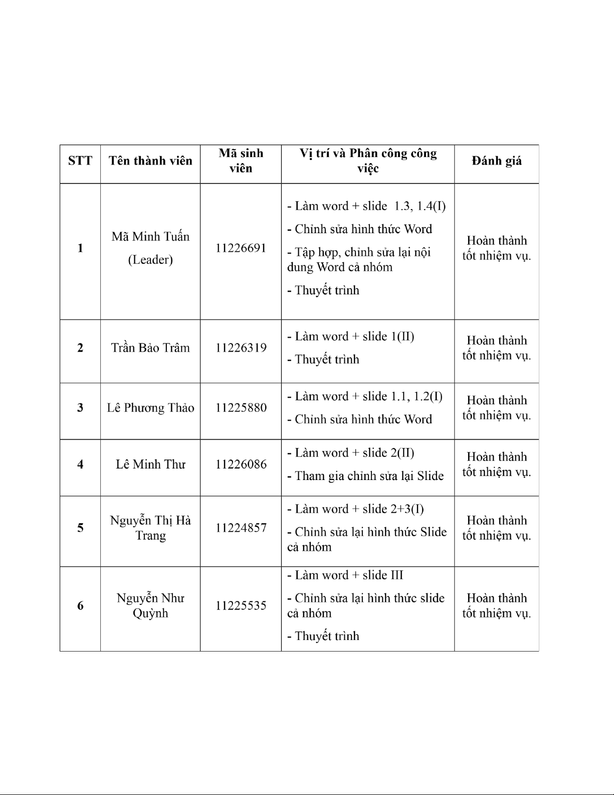 BẢNG PHÂN CÔNG CÔNG VIỆC VÀ ĐÁNH GIÁ CÁC THÀNH VIÊN TRONG NHÓM MỤC LỤC
