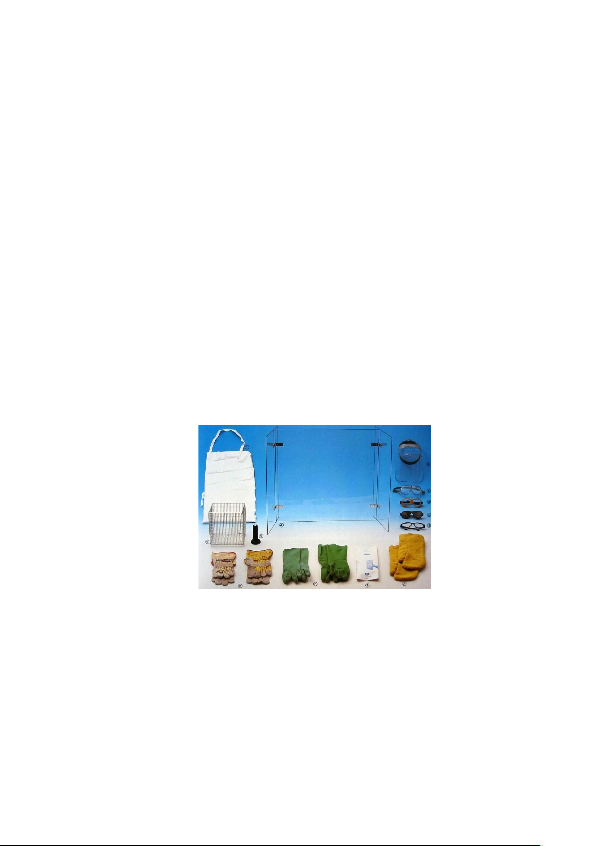 su, 4. Tấm chắn bằng thủy tinh acrylic, 5.6.7.8. Găng tay, 9. Tấm bảo vệ phần mặt,