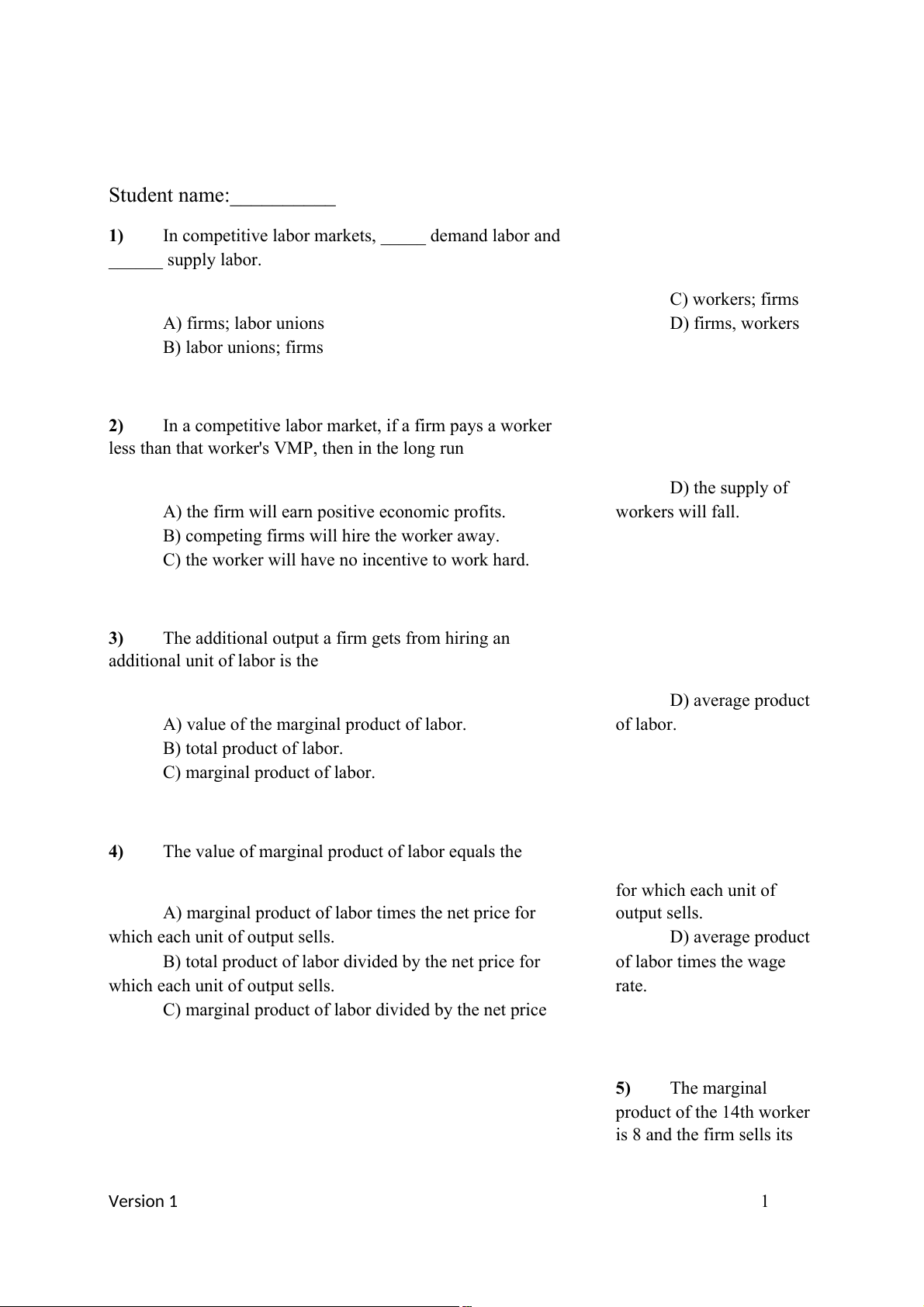 C) marginal product of labor divided by the net price 5) The marginal product of the 14th worker is 8 and the firm sells its Version 1 1