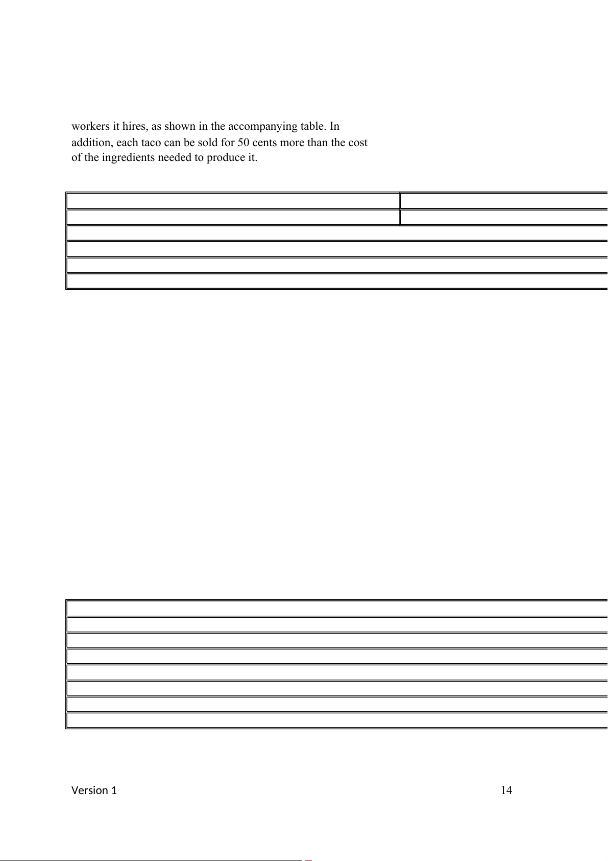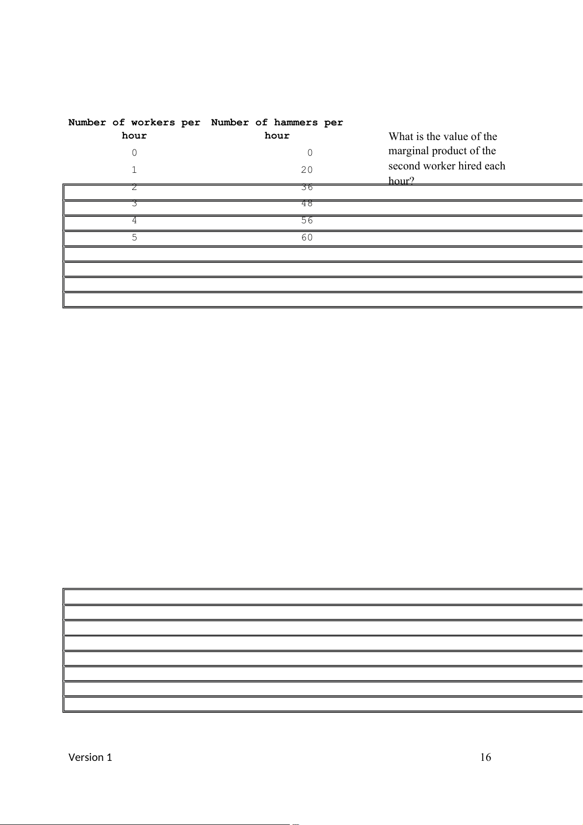 than the cost of the ingredients needed to produce it. Number of workers per Number of tacos per 5 75 hour hour 0 0 If the hourly wage for 1 25 people who make tacos is 2 45 $8, then how many 3 60 workers should the Tasty Taco Company hire each 4 70 hour? C) 3 A) 1 D) 4 B) 2 Version 1 15 Number of workers per Number of hammers per hour hour What is the value of the 0 0 marginal product of the 1 20 second worker hired each hour? 2 36 3 48 4 56 5 60 Version 1 16 C) $16 A) $36 D) $32 B) $72 28)