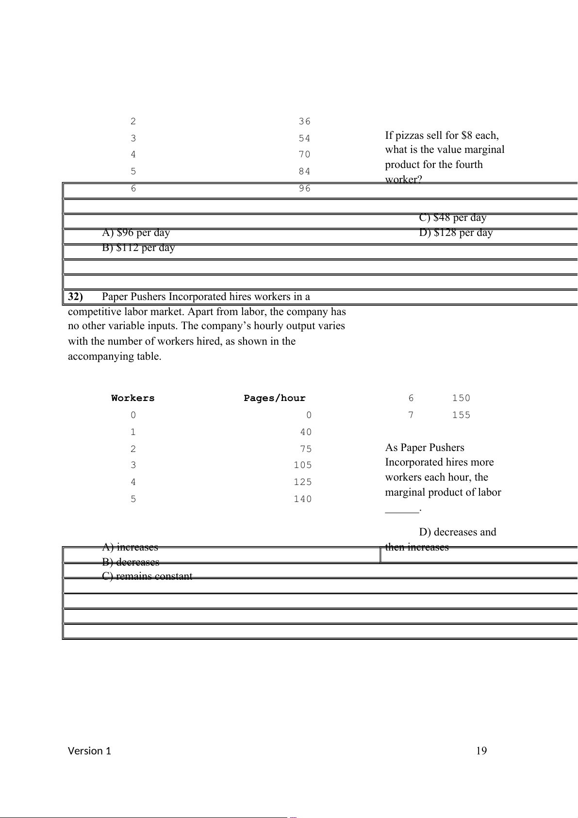 number of workers hired, as shown in the accompanying table. Number of workers Pizzas/day 0 0 1 16 Version 1 18 2 36 3 54 If pizzas sell for $8 each, what is the value marginal 4 70 product for the fourth 5 84 worker? 6 96 C) $48 per day A) $96 per day D) $128 per day B) $112 per day 32)