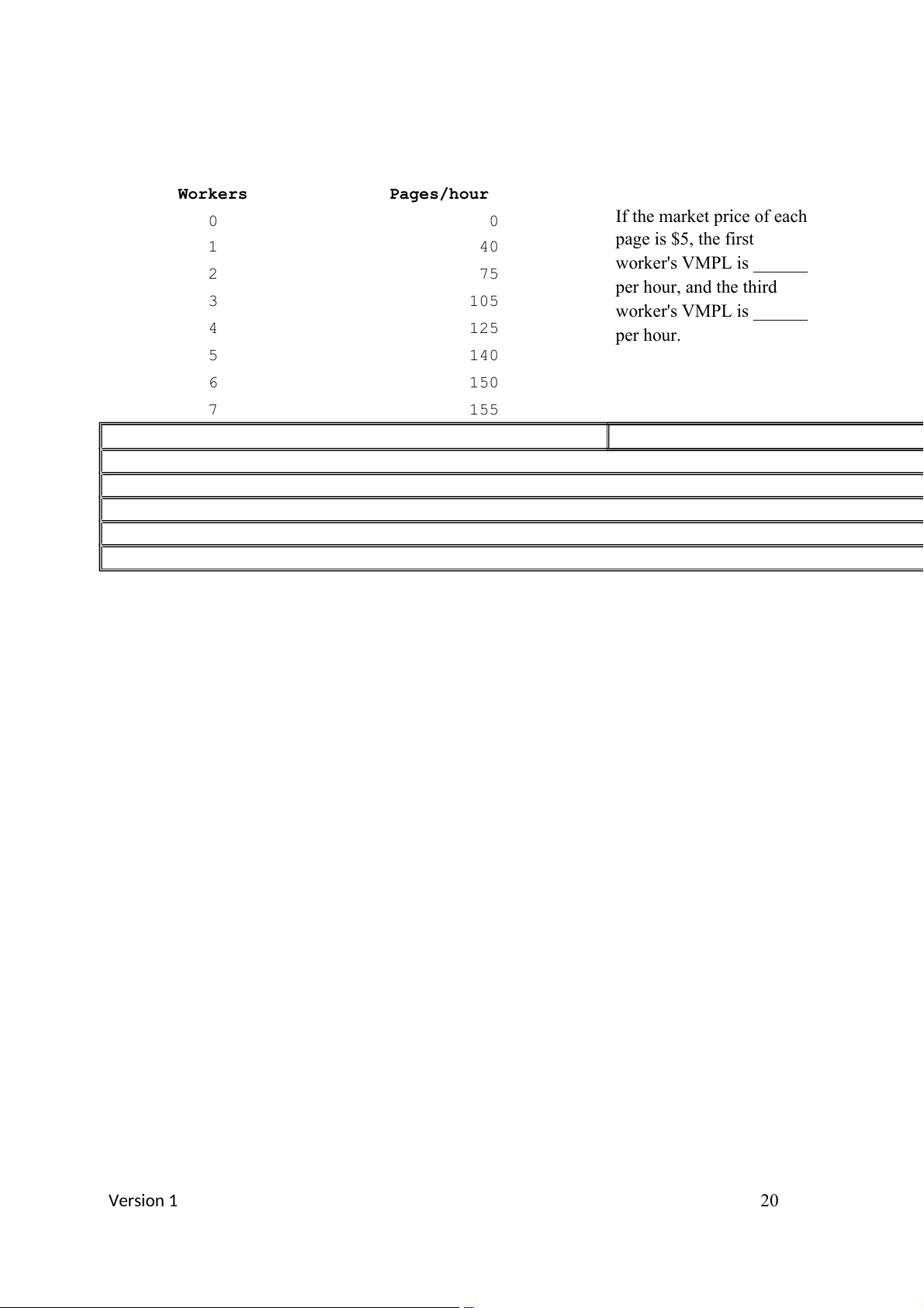 with the number of workers hired, as shown in the accompanying table. Workers Pages/hour 6 150 0 0 7 155 1 40 2 75 As Paper Pushers 3 105 Incorporated hires more workers each hour, the 4 125 marginal product of labor 5 140 ______. D) decreases and A) increases then increases B) decreases C) remains constant Version 1 19 Workers Pages/hour 0 0 If the market price of each page is $5, the first 1 40 worker's VMPL is ______ 2 75 per hour, and the third 3 105 worker's VMPL is ______ 4 125 per hour. 5 140 6 150 7 155 Version 1 20
