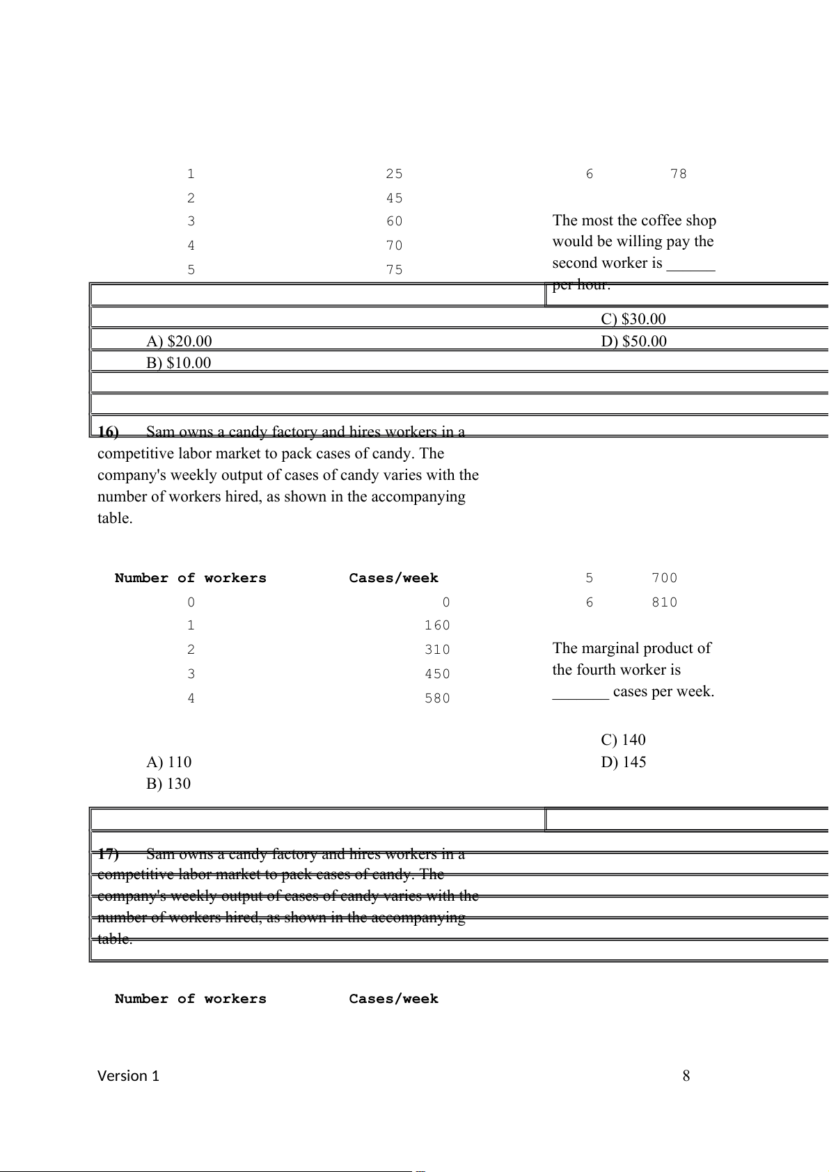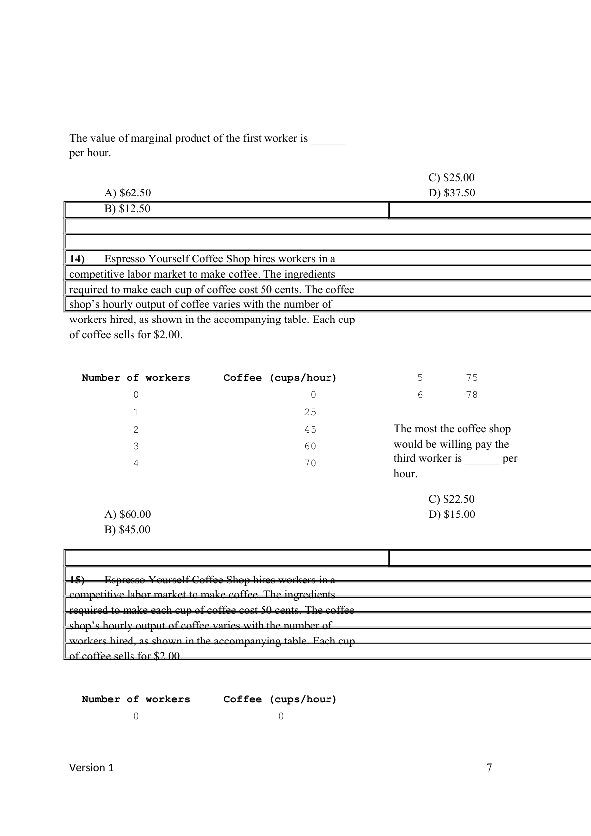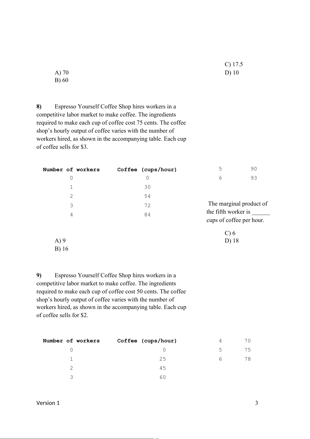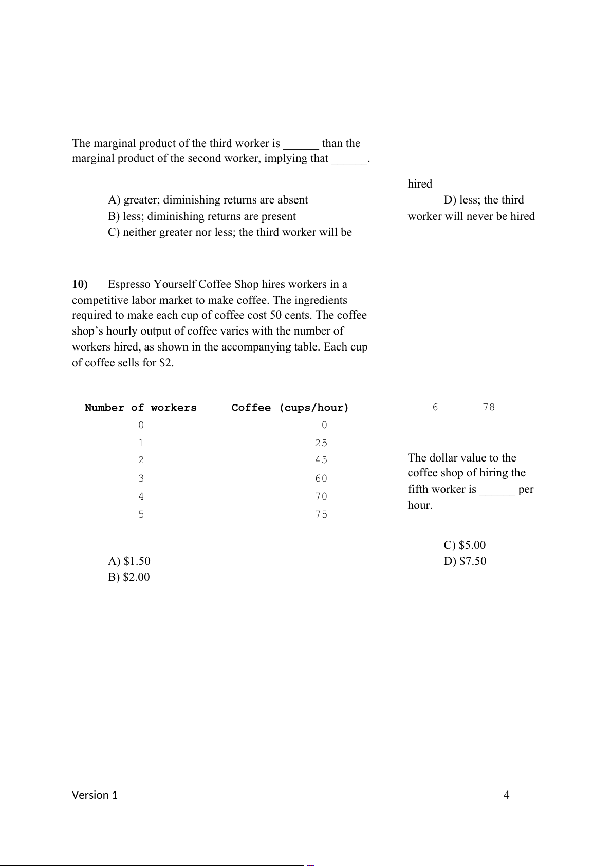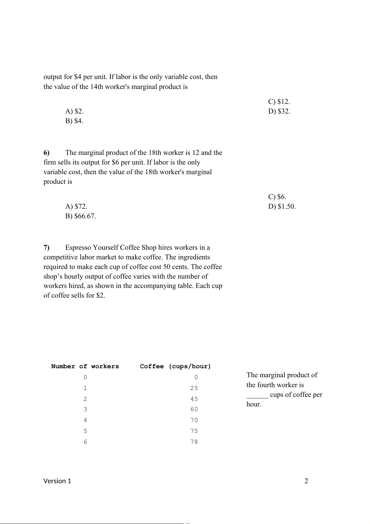 workers hired, as shown in the accompanying table. Each cup of coffee sells for $2. Number of workers Coffee (cups/hour) 6 78 0 0 1 25 2 45 The dollar value to the coffee shop of hiring the 3 60 fifth worker is ______ per 4 70 hour. 5 75 C) $5.00 A) $1.50 D) $7.50 B) $2.00 Version 1 4 Number of workers Coffee (cups/hour) 0 0 The dollar value to the coffee shop of hiring the 1 25 fifth worker is ______ per 2 45 hour. 3 60 4 70 5 75 6 78 Version 1 5 C) $12.50 A) $2.50 D) $7.50 B) $5.00 12)