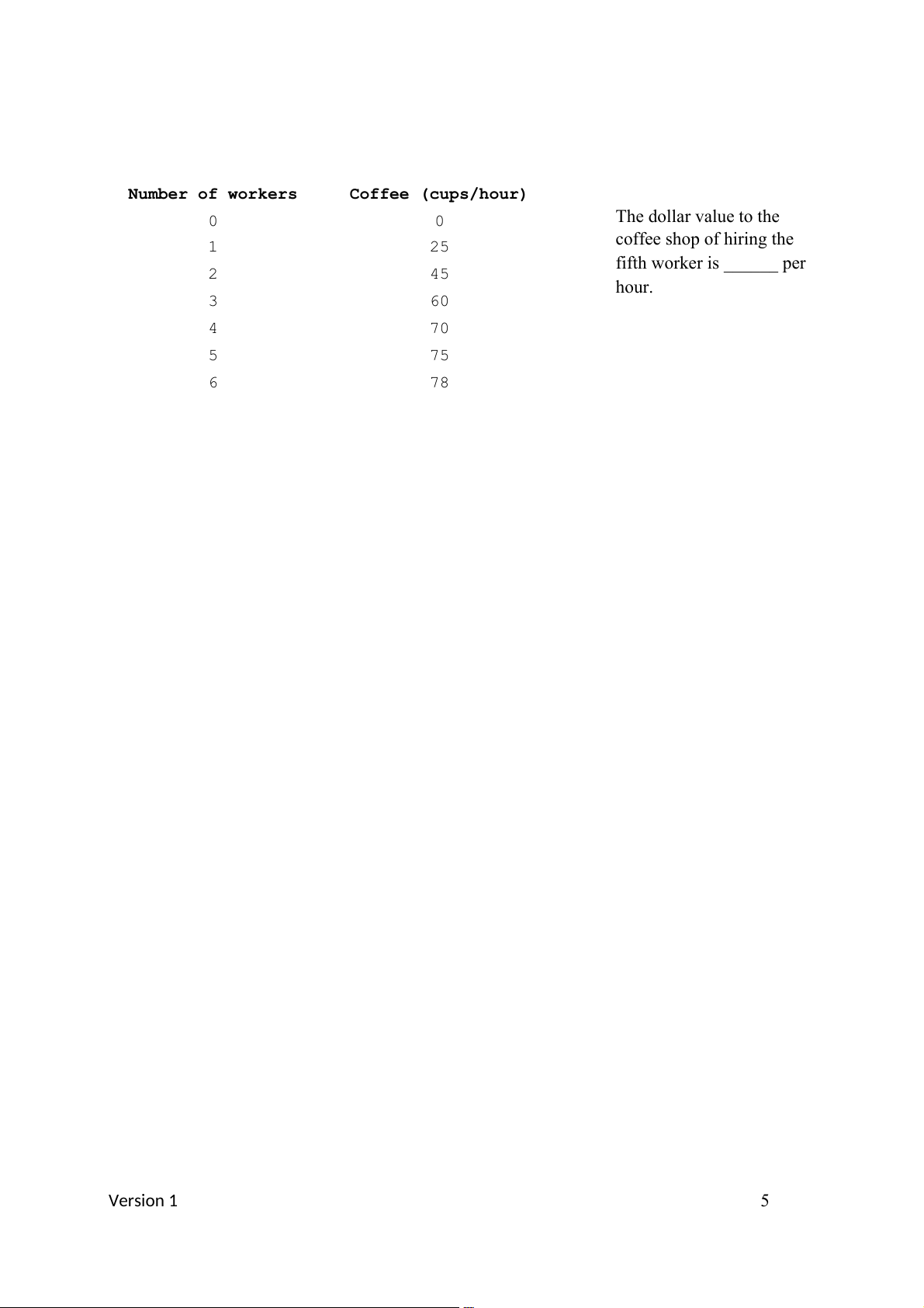 workers hired, as shown in the table. Each cup of coffee sells for $2.00. Number of workers Coffee (cups/hour) 4 70 0 0 5 75 1 25 6 78 2 45 3 60 Version 1 6