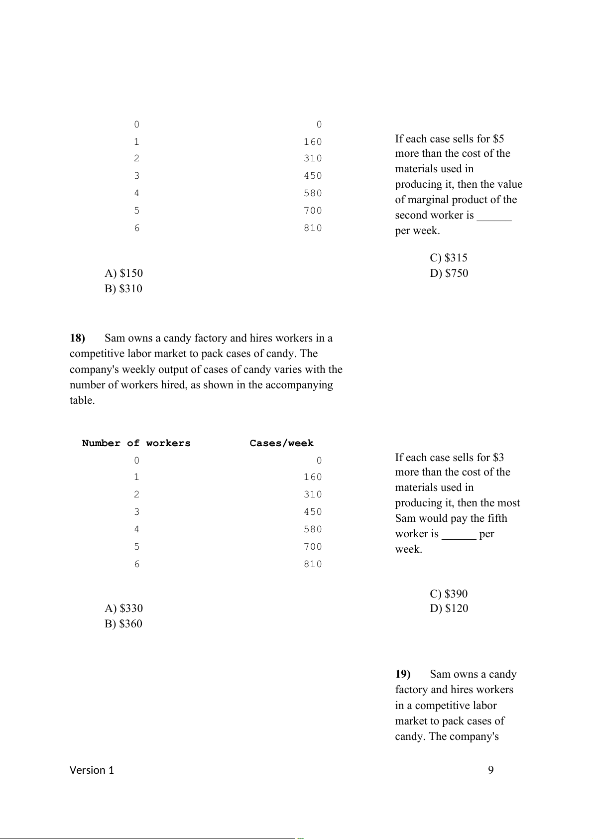 number of workers hired, as shown in the accompanying table. Number of workers Cases/week 0 0 If each case sells for $3 more than the cost of the 1 160 materials used in 2 310 producing it, then the most 3 450 Sam would pay the fifth 4 580 worker is ______ per 5 700 week. 6 810 C) $390 A) $330 D) $120 B) $360 19) Sam owns a candy factory and hires workers in a competitive labor market to pack cases of candy. The company's Version 1 9