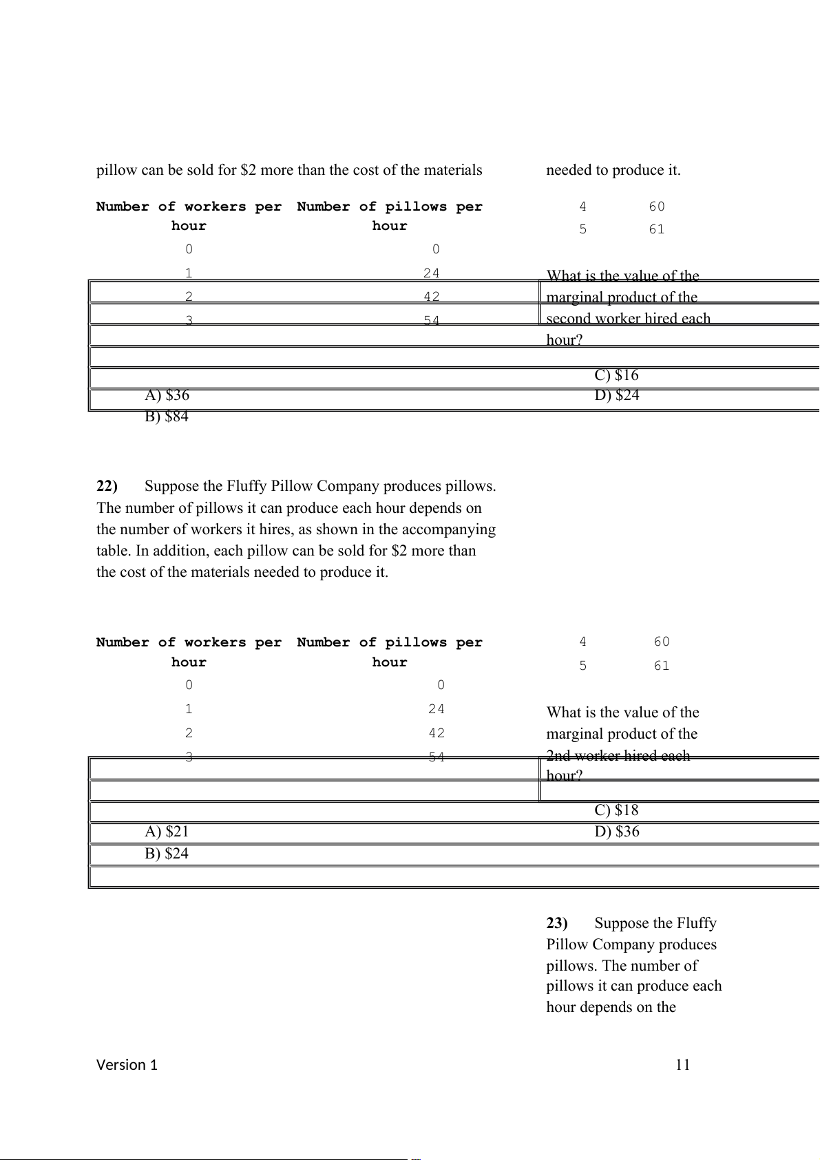 the cost of the materials needed to produce it. Number of workers per Number of pillows per 4 60 hour hour 5 61 0 0 1 24 What is the value of the 2 42 marginal product of the 3 54 2nd worker hired each hour? C) $18 A) $21 D) $36 B) $24 23) Suppose the Fluffy Pillow Company produces pillows. The number of pillows it can produce each hour depends on the Version 1 11