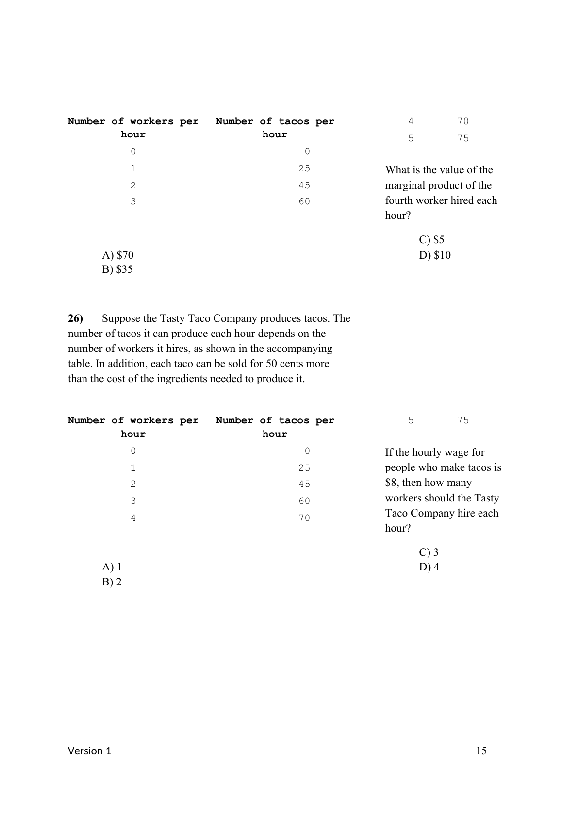 of the ingredients needed to produce it. Version 1 14 Number of workers per Number of tacos per 4 70 hour hour 5 75 0 0 1 25 What is the value of the 2 45 marginal product of the 3 60 fourth worker hired each hour? C) $5 A) $70 D) $10 B) $35 26)