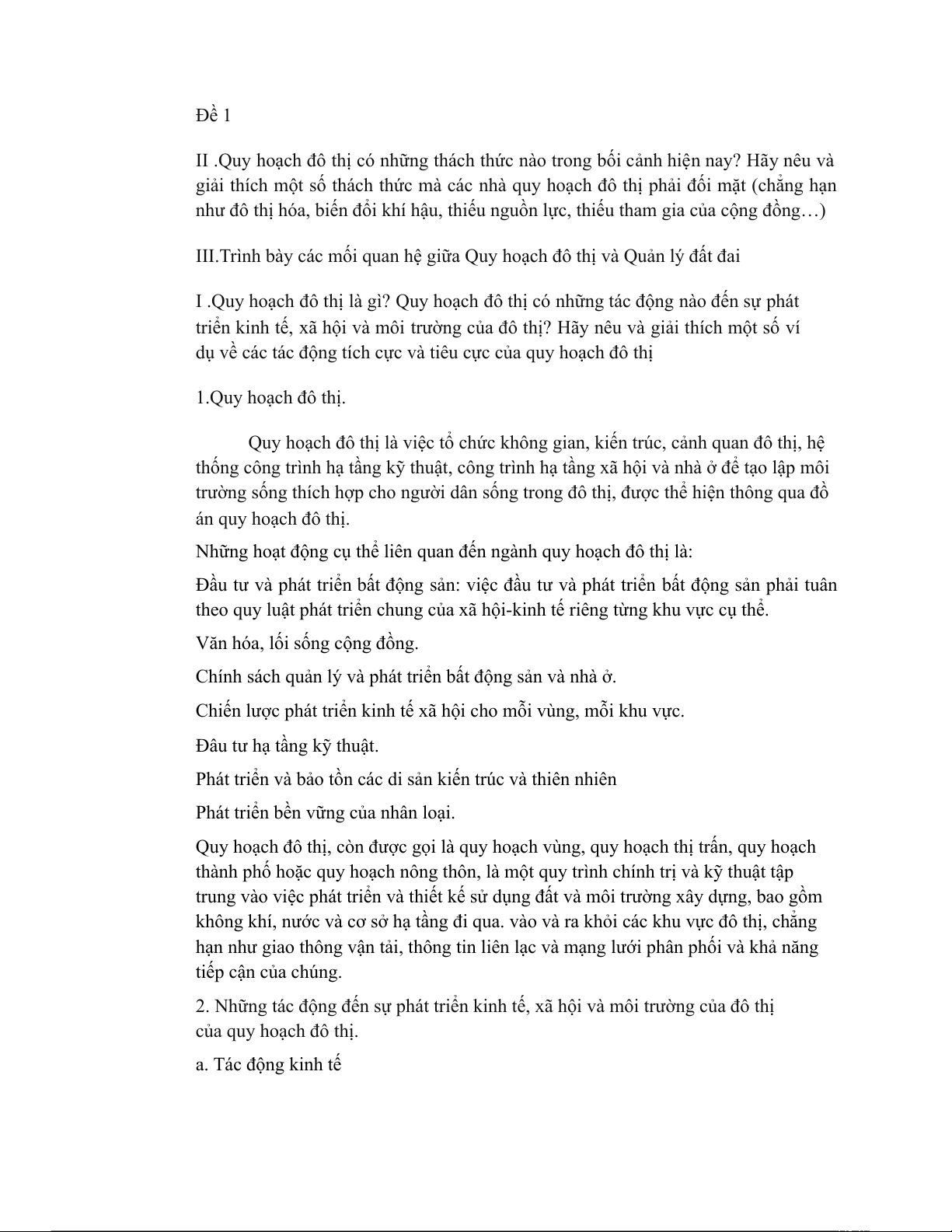 2. Những tác động đến sự phát triển kinh tế, xã hội và môi trường của đô thị của quy hoạch đô thị. a. Tác động kinh tế