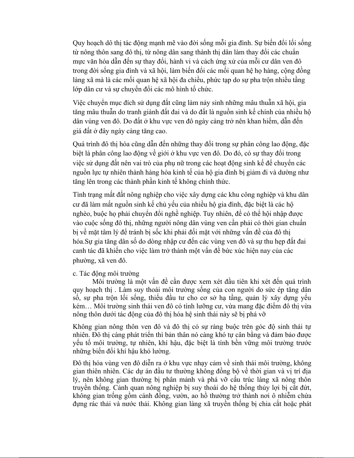 canh tác đã khiến cho việc làm trở thành một vấn đề bức xúc hiện nay của các phường, xã ven đô. c. Tác động môi trường